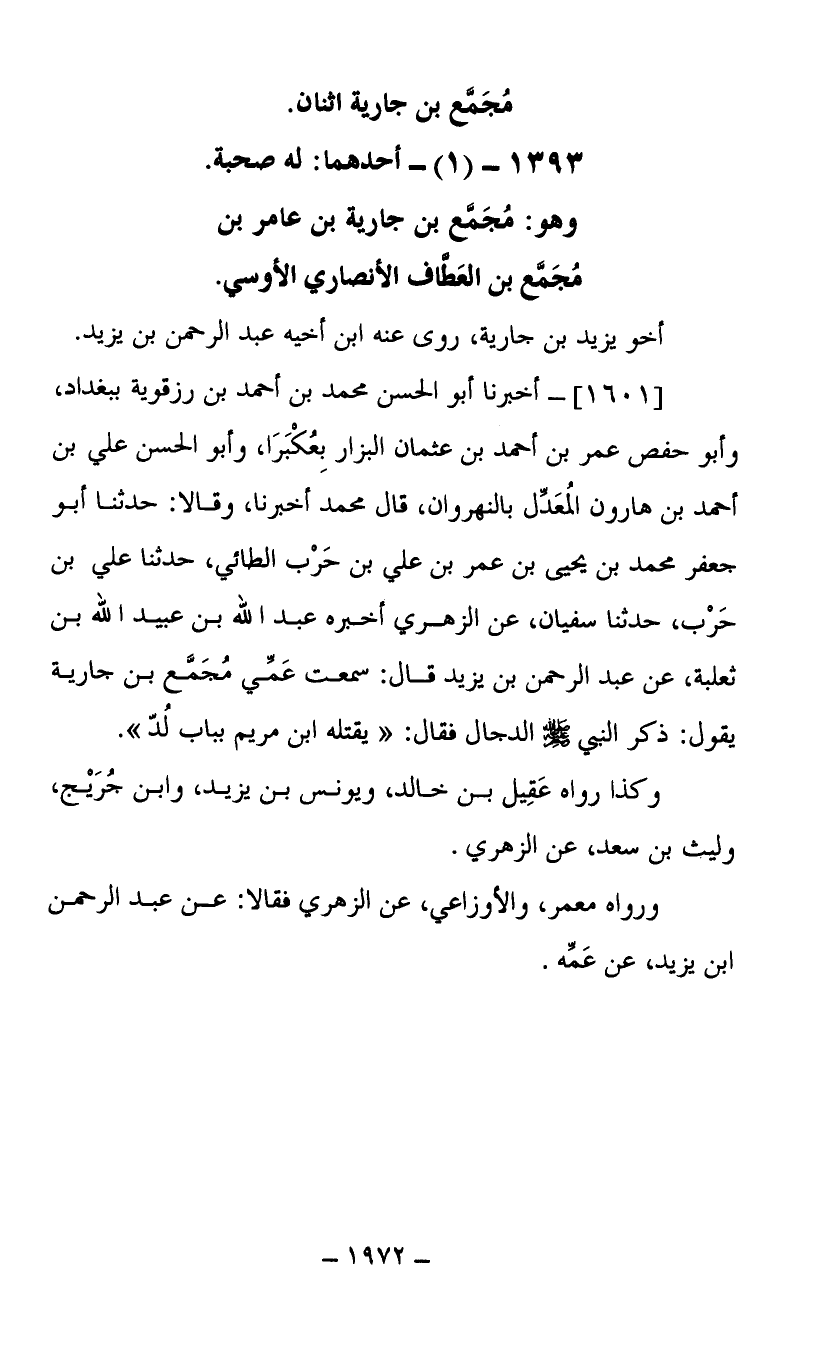 1393- (1) أحدهما له صحبة وهو مجمع بن جارية بن عامر بن مجمع بن العطاف الأنصاري الأوسي.