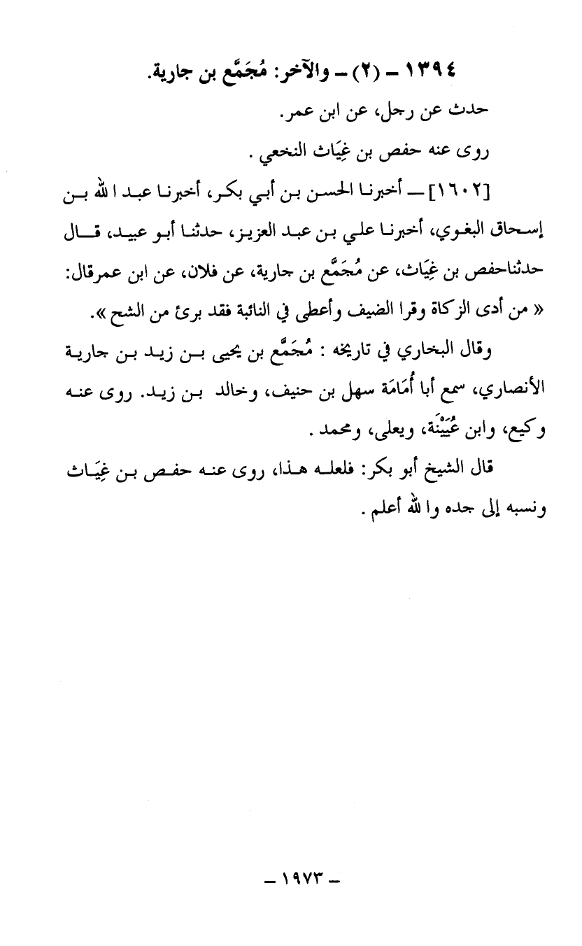 (1602) أخبرنا الحسن بن أبي بكر أخبرنا عبد الله بن إسحاق البغوي أخبرناعلي بن عبد العزيز حدث أبو عبيد قال حدثنا حفص بن غياث عن مجمع بن جارية عن فلان عن ابن عمر قال من أدى الزكاة وقرا الضيف وأعطى في النائبة فقد برئ من الشح وقال البخاري في تاريخه مجمع بن يحيى بن زيد بن جارية الأنصاري سمع أبا أمامة سهل بن حنيف وخالد بن زيد روى عنه وكيع وابن عيينة ويعلى ومحمد قال الشيخ أبو بكر فلعله هذا روى عنه حفص بن غياث ونسبه إلى جده والله أعلم.