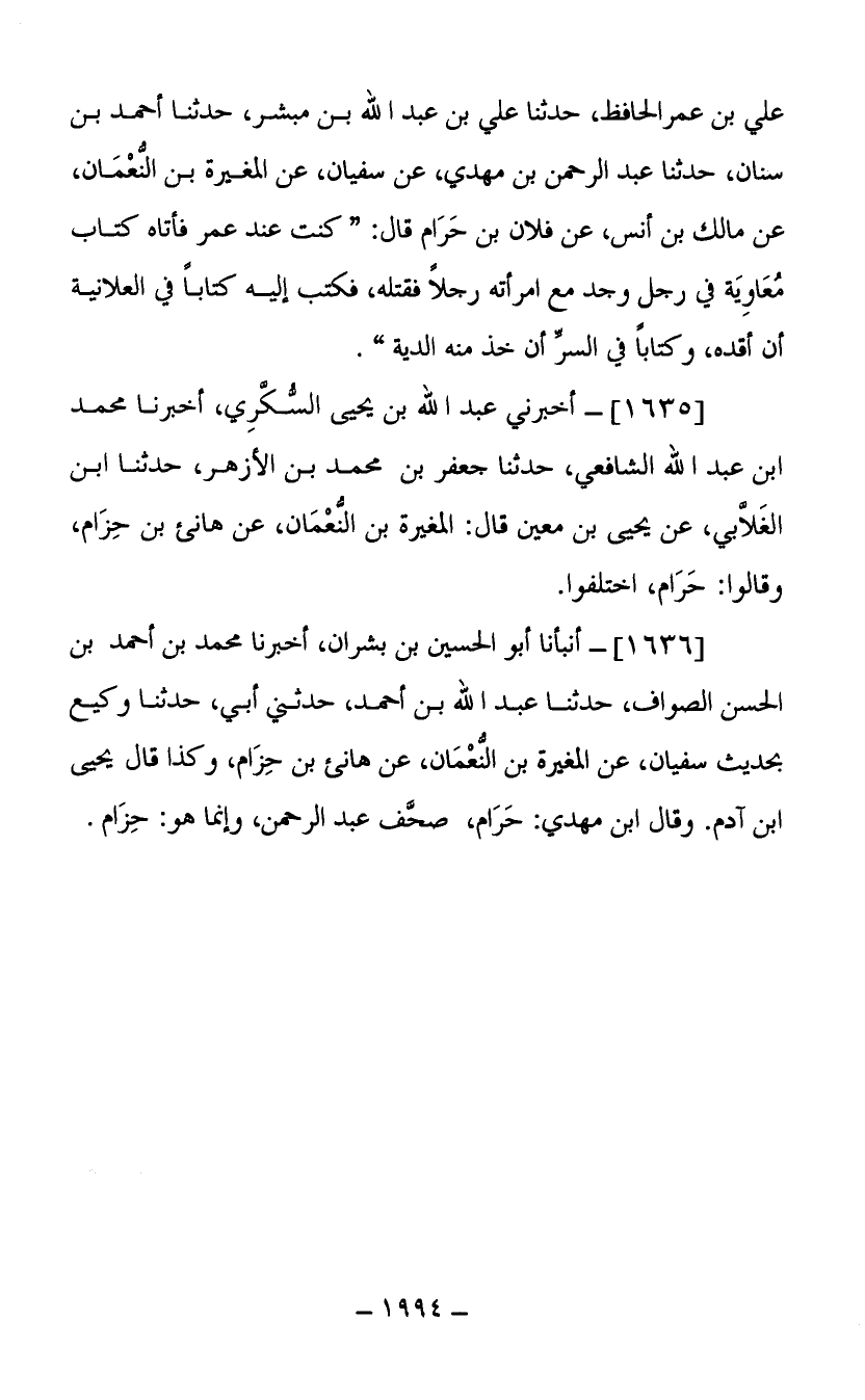 (1636) أنبأنا أبو الحسين بن بشران أخبرنا محمد بن أحمد بن الحسن الصواف حدثنا عبد الله بن أحمد حدثني أبي حدثنا وكيع بحديث سفيان عن المغيرة بن النعمان عن هانئ بن حزام وكذا قال يحيى ابن آدم وقال ابن مهدي حرام صحف عبد الرحمن وإنما هو حزام.