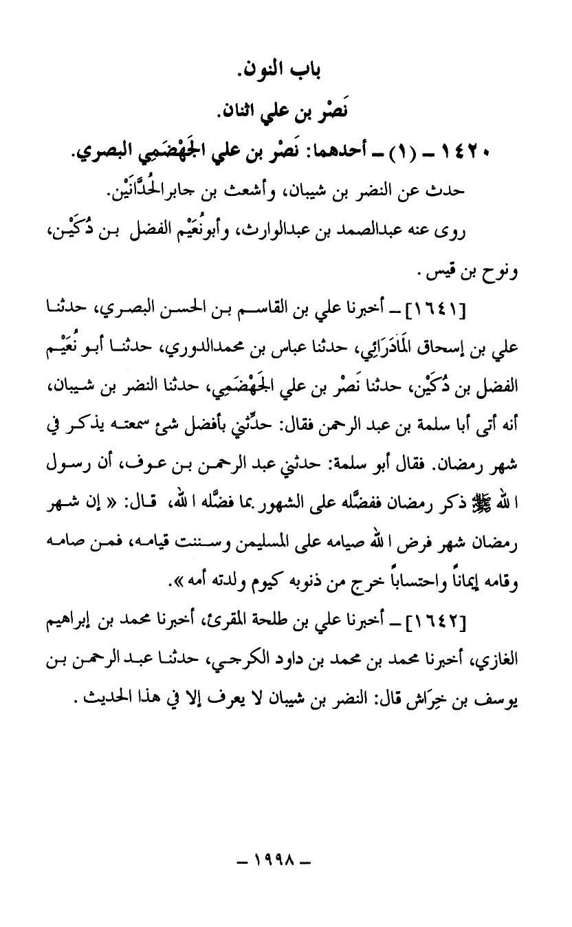 (1642) أخبرنا علي بن طلحة المقرئ أخبرنا محمد بن إبراهيم الغازي أخبرنا محمد بن محمد بن داود الكرجي حدثنا عبد الرحمن بن يوسف بن خراش قال النضر بن شيبان لا يعرف إلا في هذا الحديث.