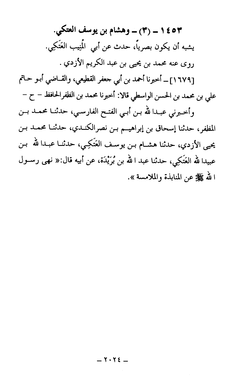 (1679) أخبرنا أحمد بن أبي جعفر القطيعي والقاضي أبو حاتم علي بن محمد بن الحسن الواسطي قالا أخبرنا محمد بن الظفر الحافظ ح وأخبرني عبد الله بن أبي الفتح الفارسي حدثنا محمد بن المظفر حدثنا إسحاق بن إبراهيم بن نصر الكندي حدثنا محمد بن يحيى الأزدي حدثنا هشام بن يوسف العتكي حدثنا عبد الله بن عبيد الله العتكي حدثنا عبد الله بن بريدة عن أبيه قال نهى رسول الله صلى الله عليه وسلم عن المنابذة والملامسة.