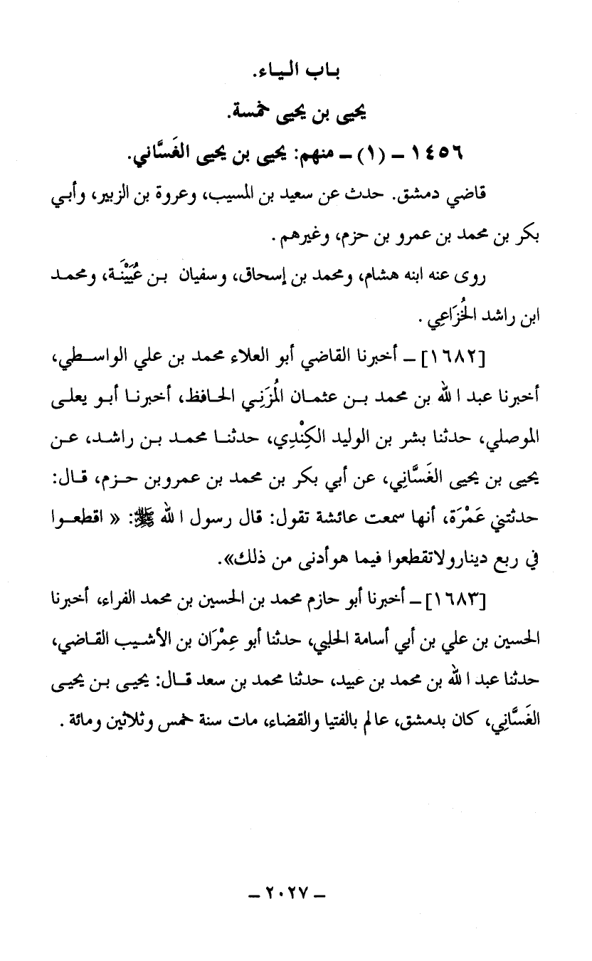 (1683) أخبرنا أبو حازم محمد بن الحسين بن محمد الفراء أخبرنا الحسين بن علي بن أبي أسامة الحلبي حدثنا أبو عمران بن الأشيب القاضي حدثنا عبد الله بن محمد بن عبيد حدثنا محمد بن سعد قال يحيى بن يحيى الغساني كان بدمشق عالم بالفتيا والقضاء مات سنة خمس وثلاثين ومائة.