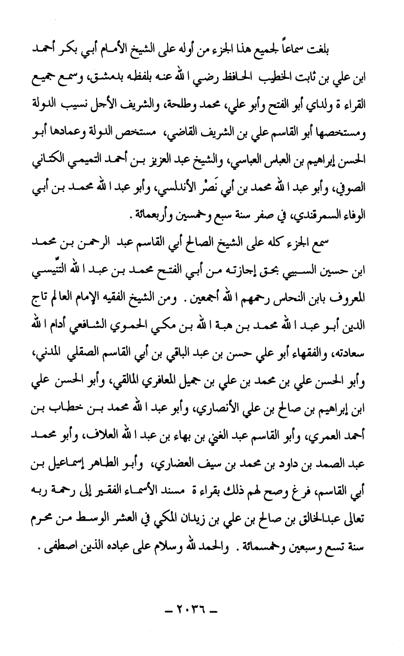 بلغت سماعا لجميع هذا الجزء من أوله على الشيخ الأمام أبي بكر أحمد ابن علي بن ثابت الخطيب الحافظ رضي الله عنه بلفظه بدمشق وسمع جميع القراءة ولداي أبو الفتح وأبو علي محمد وطلحة والشريف الأجل نسيب الدولة ومستخصها أبو القاسم علي بن الشريف القاضي مستخص الدولة وعمادها أبو الحسن إبراهيم بن العباس العباسي والشيخ عبد العزيز بن أحمد التميمي الكتاني الصوفي وأبو عبد الله محمد بن أبي نصر الأندلسي وأبو عبد الله محمد بن أبي الوفاء السمرقندي في صفر سنة سبع وخمسين وأربعمائة سمع الجزء كله على الشيخ الصالح أبي القاسم عبد الرحمن بن محمد ابن حسين السبيي بحق إجازته من أبي الفتح محمد بن عبد الله التنيسي المعروف بابن النحاس رحمهم الله أجمعين ومن الشيخ الفقيه الإمام العالم تاج الدين أبو عبد الله محمد بن هبة الله بن مكي الحموي الشافعي أدام الله سعادته والفقهاء أبو علي حسن بن عبد الباقي بن أبي القاسم الصقلي المدني وأبو الحسن علي بن محمد بن علي بن جميل المعافري المالقي وأبو الحسن علي ابن إبراهيم بن صالح بن علي الأنصاري وأبو عبد الله محمد بن خطاب بن أحمد العمري وأبو القاسم عبد الغني بن بهاء بن عبد الله العلاف وأبو محمد عبد الصمد بن داود بن محمد بن سيف العضاري وأبو الطاهر إسماعيل بن أبي القاسم فرغ وصح لهم ذلك بقراءة مسند الأسماء الفقير إلى رحمة ربه تعالى عبد الخالق بن صالح بن علي بن زيدان المكي في العشر الوسط من محرم سنة تسع وسبعين وخمسمائة والحمد الله وسلام على عباده الذين اصطفى