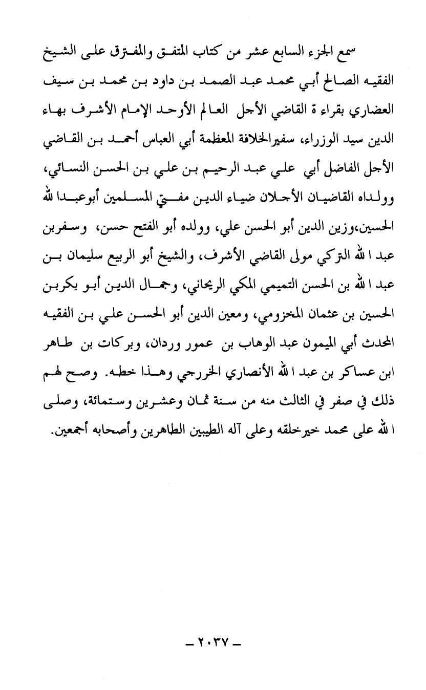 بهاء الدين سيد الوزراء سفير الخلافة المعظمة أبي العباس أحمد بن القاضي الأجل الفاضل أبي علي عبد الرحيم بن علي بن الحسن النسائي وولداه القاضيان الأجلان ضياء الدين مفتي المسلمين أبو عبد الله الحسين وزين الدين أبو الحسن علي وولده أبو الفتح حسن وسفر بن عبد الله التركي مولى القاضي الأشرف والشيخ أبو الربيع سليمان بن عبد الله بن الحسن التميمي المكي الريحاني وجمال الدين أبو بكر بن الحسين بن عثمان المخزومي ومعين الدين أبو الحسن علي بن الفقيه المحدث أبي الميمون عبد الوهاب بن عمور وردان وبركات بن طاهر ابن عساكر بن عبد الله الأنصاري الخررجي وهذا خطه وصح لهم ذلك في صفر في الثالث منه سنة ثمان وعشرين وستمائة وصلى الله على محمد خير خلقه وعلى آله الطيبين الطاهرين وأصحابه أجمعين.