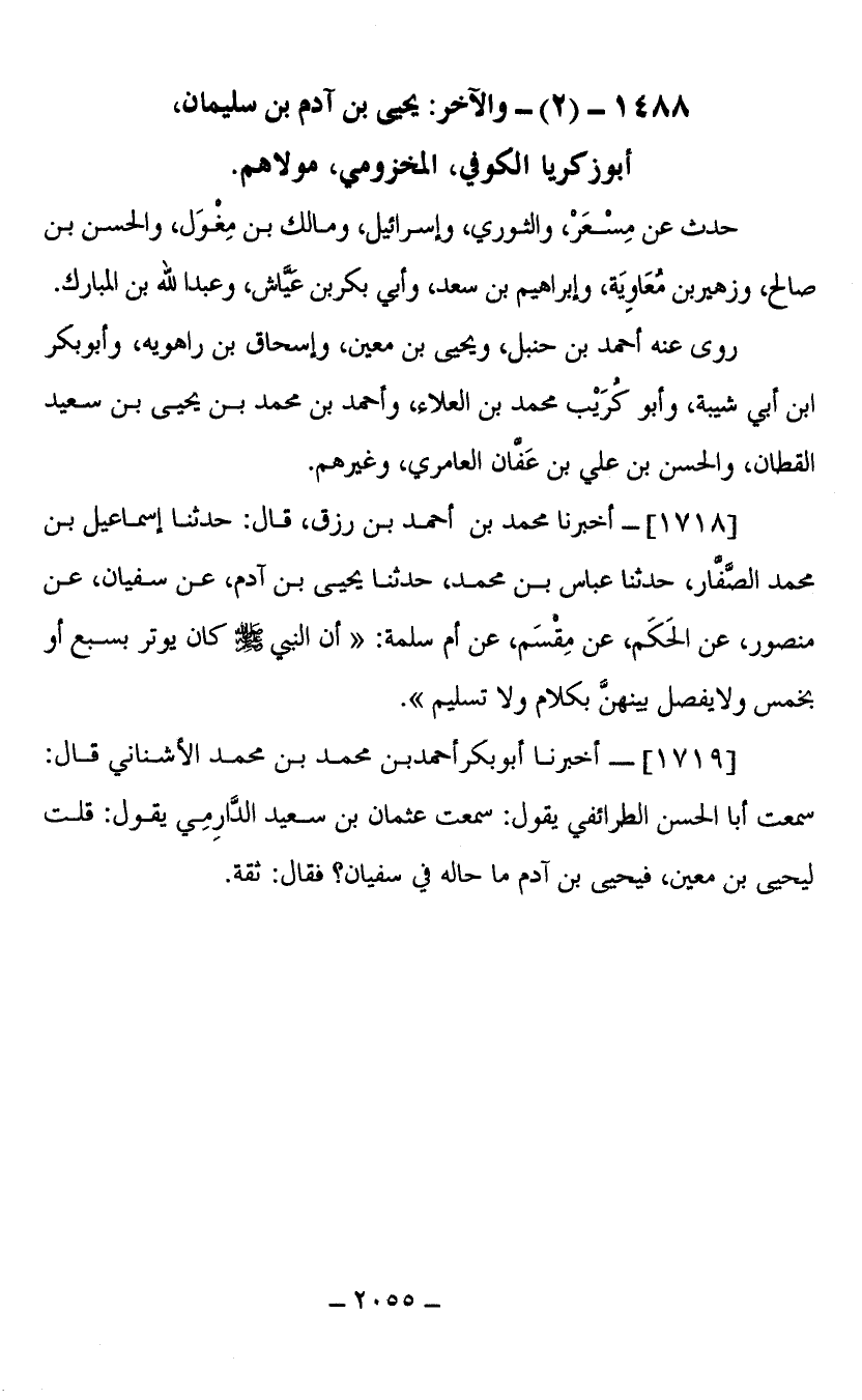 1488- (2) والآخر يحيى بن آدم بن سليمان أبو زكريا الكوفي المخزومي مولاهم