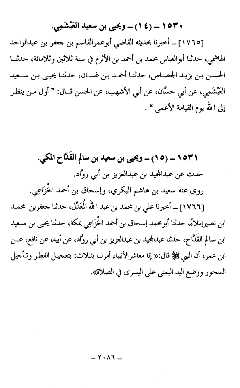 (1765) أخبرنا بحديثه القاضي أبو عمر القاسم بن جعفر بن عبد الواحد الهاشمي حدثنا أبو العباس محمد بن أحمد بن الأثرم في سنة ثلاثين وثلاثمائة حدثنا الحسن بن يزيد الجصاص حدثنا أحمد بن غسان حدثنا يحيى بن سعيد العبشمي عن أبي حسان عن أبي الأشهب عن الحسن قال أول من ينظر إلى الله يوم القيامة الأعمى.