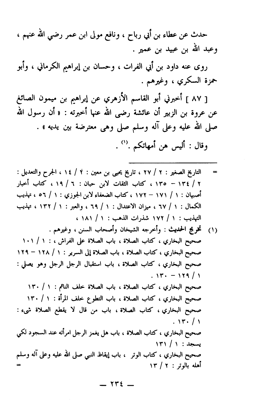 (87) أخبرني أبو القاسم الأزهري عن إبراهيم بن ميمون الصائغ عن عروة بن الزبير أن عائشة رضي الله عنها أخبرته أن رسول الله صلى الله عليه وعلى آله وسلم صلى وهي معترضة بين يديه وقال أليس هن أمهاتكم.
