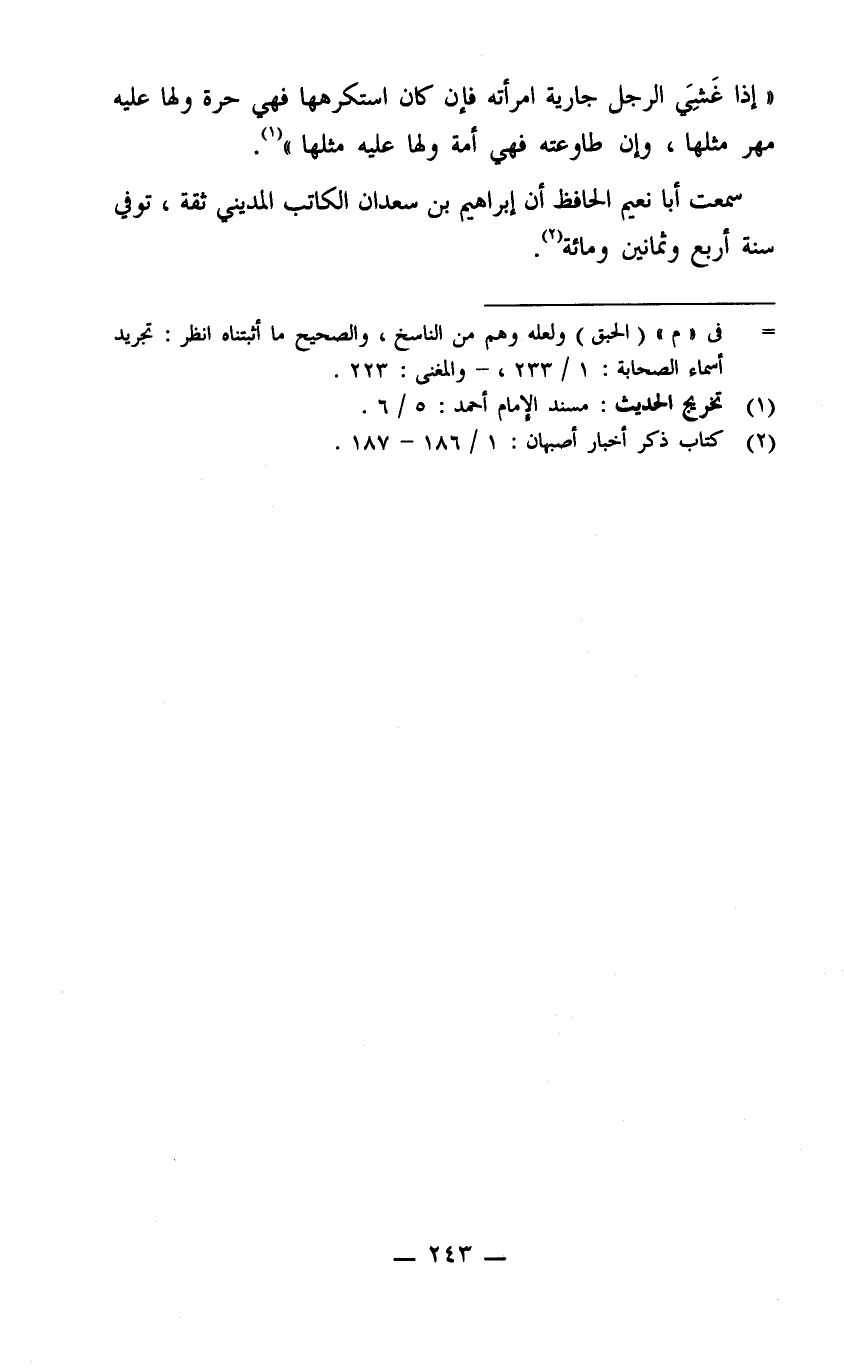إذا غشي الرجل جارية امرأته فإن كان استكرهها فهي حرة ولها عليه مهر مثلها وإن طاوعته فهي أمة ولها عليه مثلها سمعت أبا نعيم الحافظ أن إبراهيم بن سعدان الكاتب المديني ثقة توفي سنة أربع وثمانين ومائة.