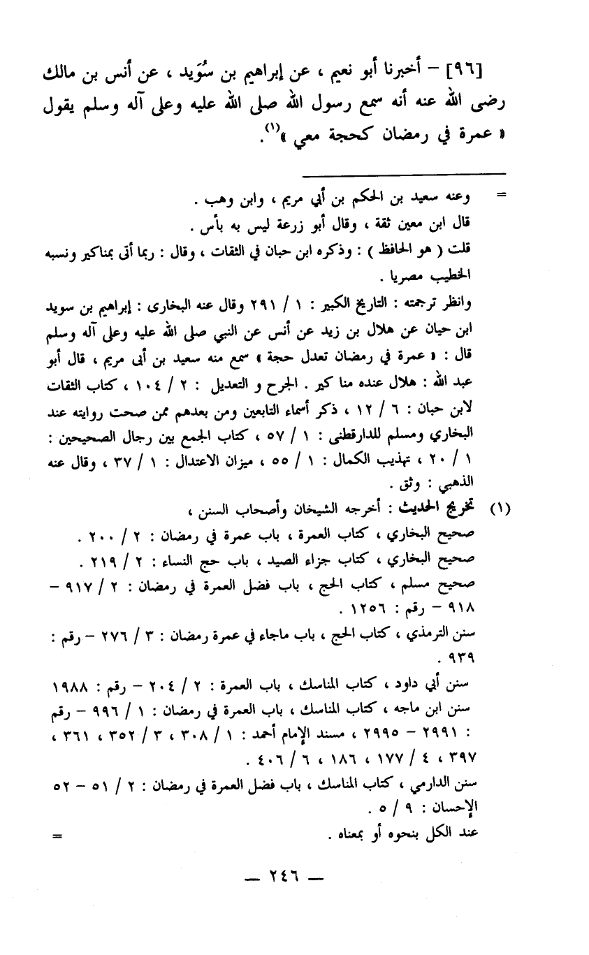 (96) أخبرنا أبو نعيم عن إبراهيم بن سويد عن أنس بن مالك رضي الله عنه أنه سمع رسول الله صلى الله عليه وعلى آله وسلم يقول عمرة في رمضان كحجة معي.