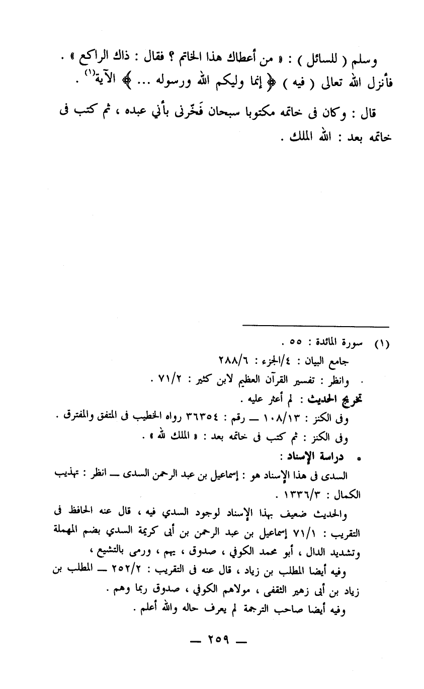 وسلم للسائل من أعطاك هذا الخاتم فقال ذاك الراكع فأنزل الله تعالى فيه {إنما وليكم الله ورسوله ... } الآية قال وكان في خاتمه مكتوبا سبحان فخرني بأني عبده ثم كتب في خاتمه بعد الله الملك.