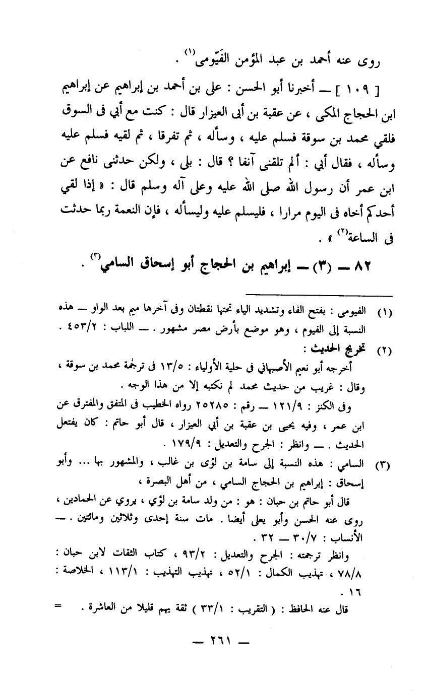 (109) أخبرنا أبو الحسن علي بن أحمد بن إبراهيم عن إبراهيم ابن الحجاج المكي عن عقبة بن أبي العيزار قال كنت مع أبي في السوق فلقي محمد بن سوقة فسلم عليه وسأله ثم تفرقا ثم لقيه فسلم عليه وسأله فقال أبي ألم تلقني آنفاً قال بلى ولكن حدثني نافع عن ابن عمر أن رسول الله صلى الله عليه وعلى آله وسلم قال إذا لقي أحدكم أخاه في اليوم مرارا فليسلم عليه وليسأله فإن النعمة ربما حدثت في الساعة.