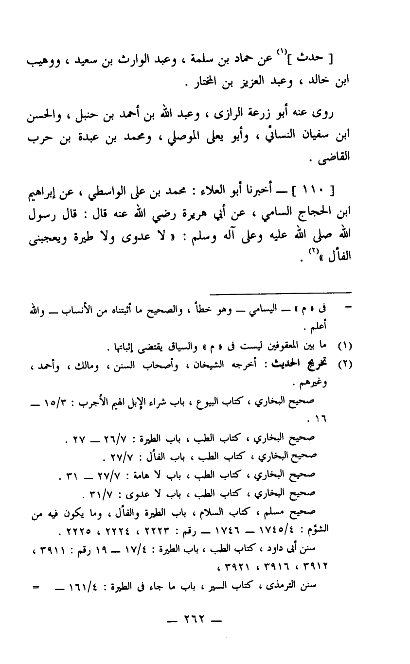 (110) أخبرنا أبو العلاء محمد بن علي الواسطي عن إبراهيم ابن الحجاج السامي عن أبي هريرة رضي الله عنه قال قال رسول الله صلى الله عليه وعلى آله وسلم لا عدوى ولا طيرة ويعجبني الفأل