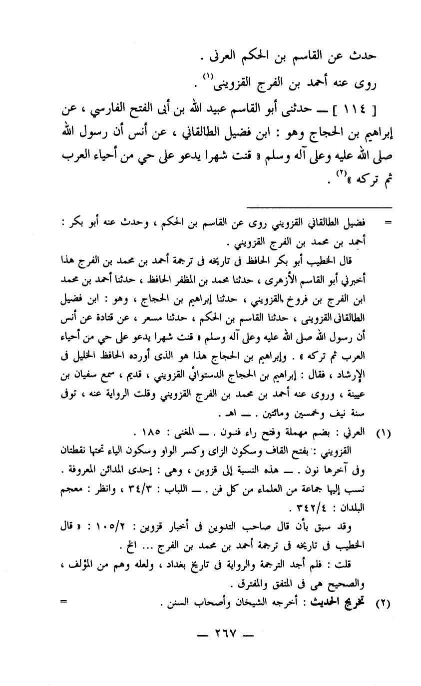 (114) حدثني أبو القاسم عبيد الله بن أبي الفتح الفارسي عن إبراهيم بن الحجاج وهو ابن فضيل الطالقاني عن أنس أن رسول الله صلى الله عليه وعلى آله وسلم قنت شهرا يدعو على حي من أحياء العرب ثم تركه.