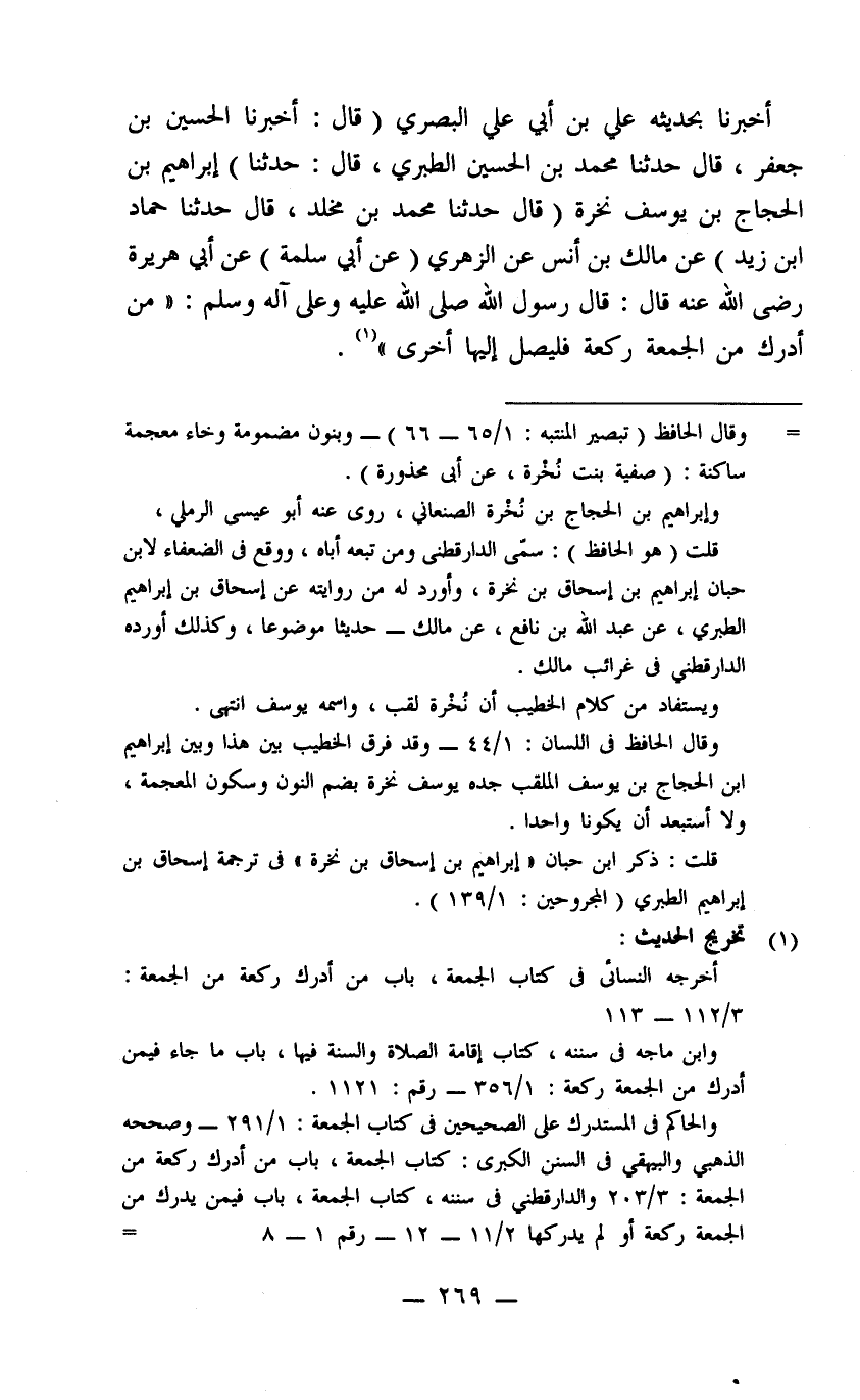 أخبرنا بحديثه علي بن أبي علي البصري قال أخبرنا الحسين بن جعفر قال حدثنا محمد بن الحسين الطبري قال حدثنا إبراهيم بن الحجاج بن يوسف نخرة قال حدثنا محمد بن مخلد قال حدثنا حماد ابن زيد عن مالك بن أنس عن الزهري عن أبي سلمة عن أبي هريرة رضي الله عنه قال قال رسول الله صلى الله عليه وعلى آله وسلم من أدرك من الجمعة ركعة فليصل إليها أخرى.