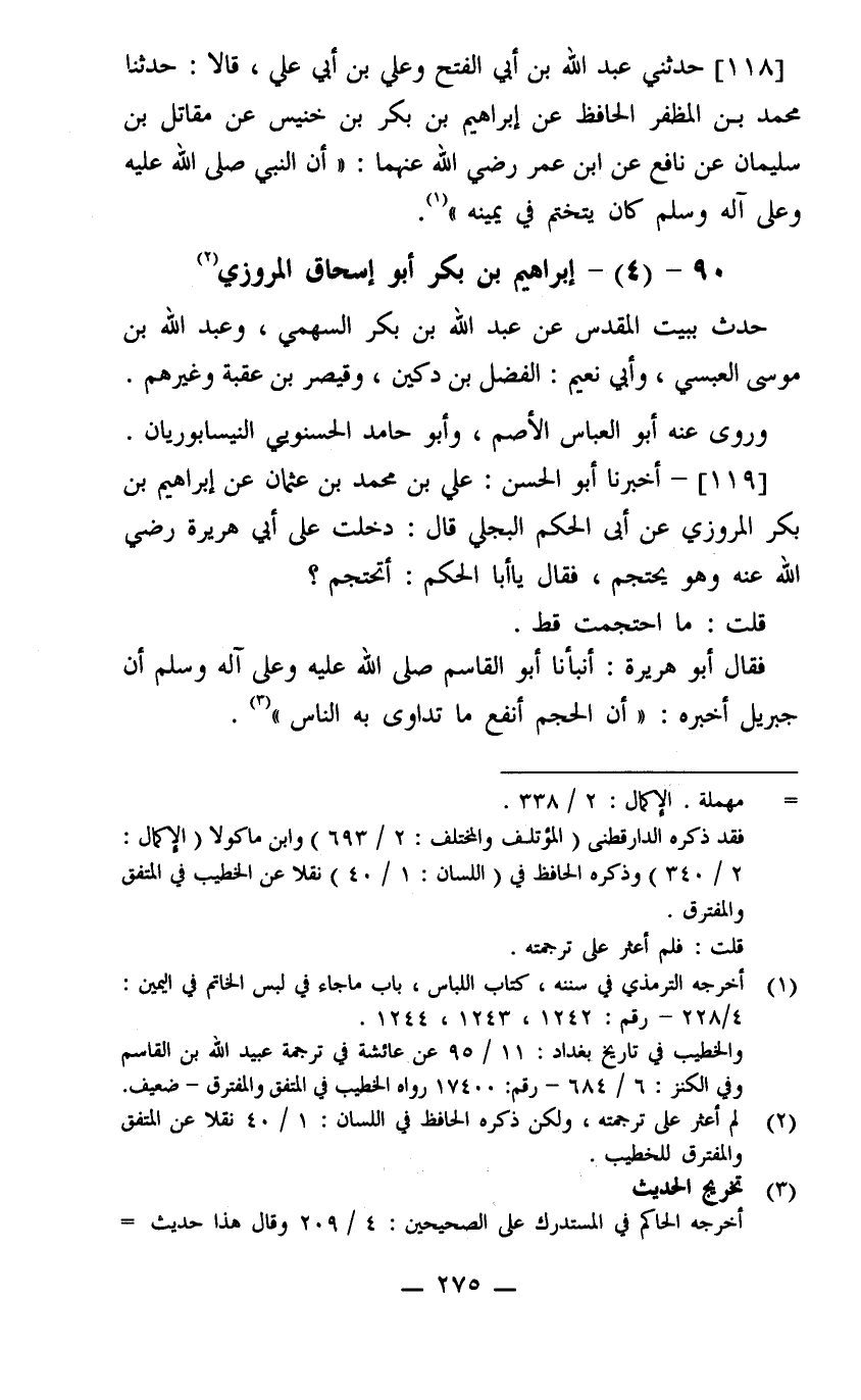 (118) حدثني عبد الله بن أبي الفتح وعلي بن أبي علي قالا حدثنا محمد بن المظفر الحافظ عن إبراهيم بن بكر بن خنيس عن مقاتل بن سليمان عن نافع عن ابن عمر رضي الله عنهما أن النبي صلى الله عليه وعلى آله وسلم كان يتختم في يمينه.