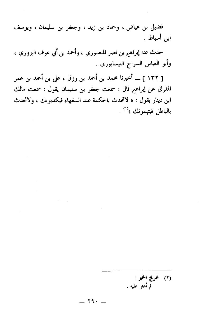 (132) أخبرنا محمد بن أحمد بن رزق علي بن أحمد بن عمر المقريء عن إبراهيم قال سمعت جعفر بن سليمان يقول سمعت مالك ابن دينار يقول لا تحدث بالحكمة عند السفهاء فيكذبوك ولا تحدث بالباطل فيتهموك.