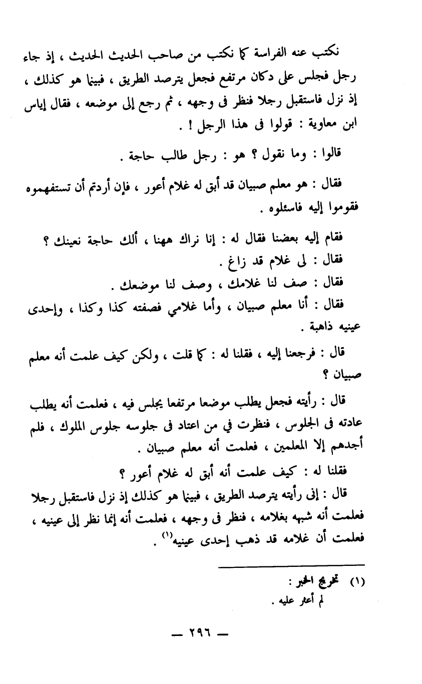 نكتب عنه الفراسة كما نكتب من صاحب الحديث الحديث، إذ جاء رجل فجلس على دكان مرتفع فجعل يترصد الطريق فبينما هو كذلك إذ نزل فاستقبل رجلا فنظر في وجهه ثم رجع إلى موضعه فقال إياس ابن معاوية قولوا في هذا الرجل قالوا وما نقول هو رجل طالب حاجة فقال هو معلم صبيان قد أبق له غلام أعور فإن أردتم أن تستفهموه فقوموا إليه فاسئلوه فقام إليه بعضنا فقال له إنا نراك ههنا ألك حاجة نعيك فقال لي غلام قد زاغ فقال صف لنا غلامك وصف لنا موضعك فقال أنا معلم صبيان وأما غلامي فقصته كذا وكذا وإحدى عينيه ذاهبة قال فرجعنا إليه فقلنا له كما قلت ولكن كيف علمت أنه معلم صبيان قال رأيته فجعل يطلب موضعا مرتفعا يجلس فيه فعلمت أنه يطلب عادته في الجلوس فنظرت في من اعتاد في جلوسه جلوس الملوك فلم أجدهم إلا المعلمين فعلمت أنه معلم صبيان فقلنا له كيف علمت أنه أبق له غلام أعور قال إني رأيته يترصد الطريق فبينما هو كذلك إذ نزل فاستقبل رجلا فعلمت أنه شبهه بغلامه فنظر في وجهه فعلمت أنه إنما نظر إلى عينيه فعلمت أن غلامه قد ذهب إحدى عينيه.