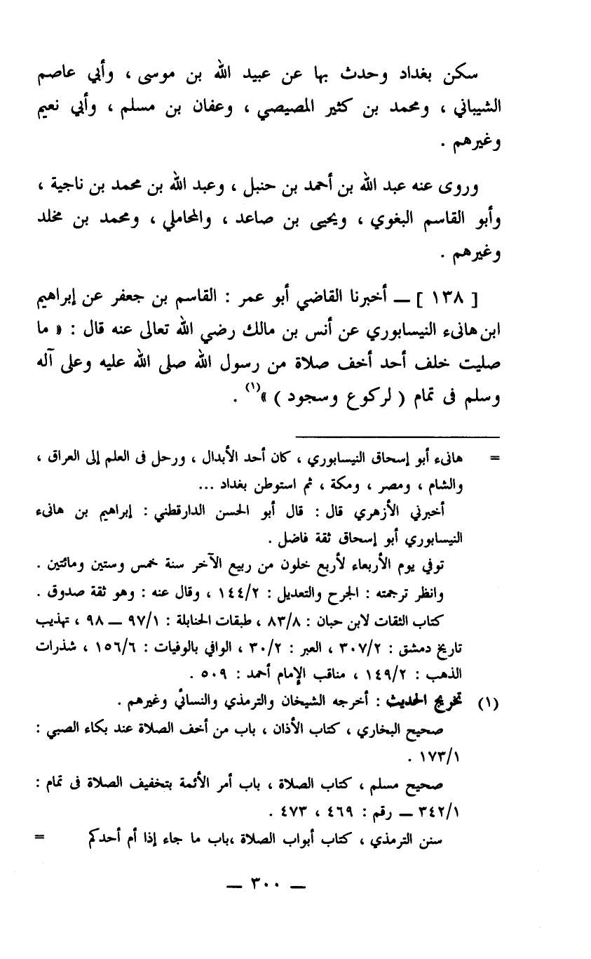 (138) أخبرنا القاضي أبو عمر القاسم بن جعفر عن إبراهيم ابن هانئ النيسابوري عن أنس بن مالك رضي الله تعالى عنه قال ما صليت خلف أحد أخف صلاة من رسول الله صلى الله عليه وعلى آله وسلم في تمام لركوع وسجود.