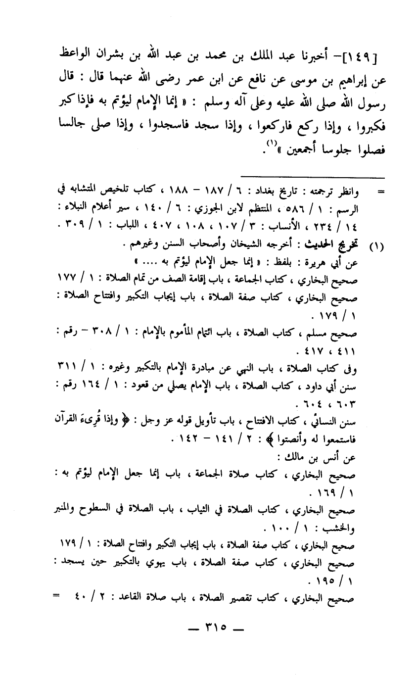(149) أخبرنا عبد الملك بن محمد بن عبد الله بن بشران الواعظ عن إبراهيم بن موسى عن نافع عن ابن عمر رضي الله عنهما قال قال رسول الله صلى الله عليه وعلى آله وسلم إنما الإمام ليؤتم به فغذا كبر فكبروا وإذا ركع فاركعوا وإذا سجد فاسجدوا وإذا صلى جالساً فصلوا جلوساً أجمعين.