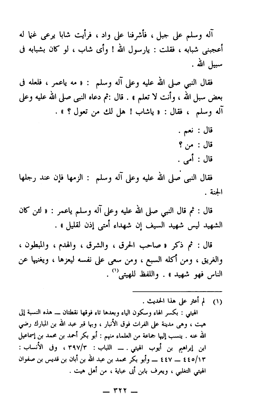 آله وسلم على جبل فأشرفنا على واد فرأيت شابا يرعى غنما له أعجبني شبابه فقلت يا رسول الله وأي شاب لو كان بشبابه في سبيل الله فقال النبي صلى الله عليه وعلى آله وسلم مه يا عمر فلعله في بعض سبل الله وأنت لا تعلم قال ثم دعاه النبي صلى الله عليه وعلى آله وسلم فقال يا شاب هل لك من تعول قال نعم قال من قال أمي فقال النبي صلى الله عليه وعلى آله وسلم الزمها فإن عند رجلها الجنة قال ثم قال النبي صلى الله عليه وعلى آله وسلم يا عمر لئن كان الشهيد ليس شهيد السيف إن شهداء أمتي إذن لقليل قال ثم ذكر صاحب الحرق والشرق والهدم والمبطون والغريق ومن أكله السبع ومن سعى على نفسه ليعزها ويغنيها عن الناس فهو شهيد واللفظ لليتي.
