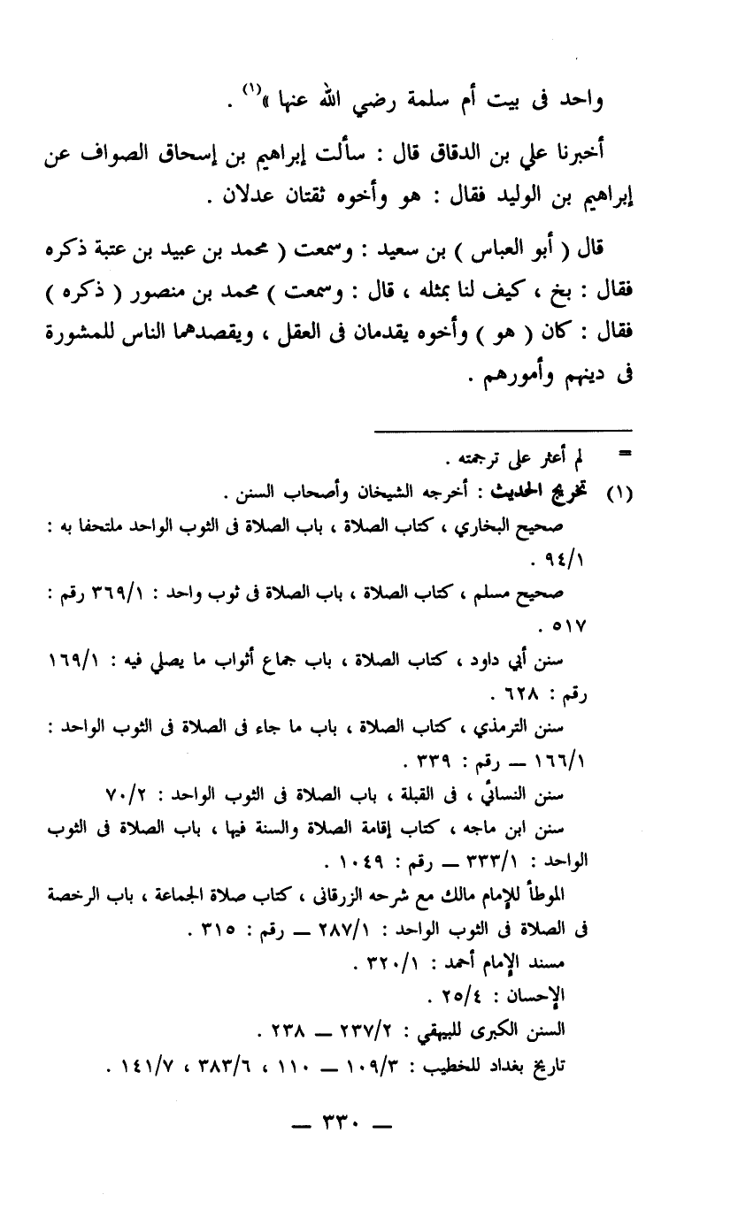واحد في بيت أم سلمة رضي الله عنها أخبرنا علي بن الدقاق قال سألت إبراهيم بن إسحاق الصواف عن إبراهيم بن الوليد فقال هو وأخوه ثقتان عدلان قال أبو العباس بن سعيد وسمعت محمد بن عبيد بن عتبة ذكره فقال بخ كيف لنا بمثله قال وسمعت محمد بن منصور ذكره فقال كان هو وأخوه يقدمان في العقل ويقصدهما الناس للمشورة في دينهم وأمورهم.