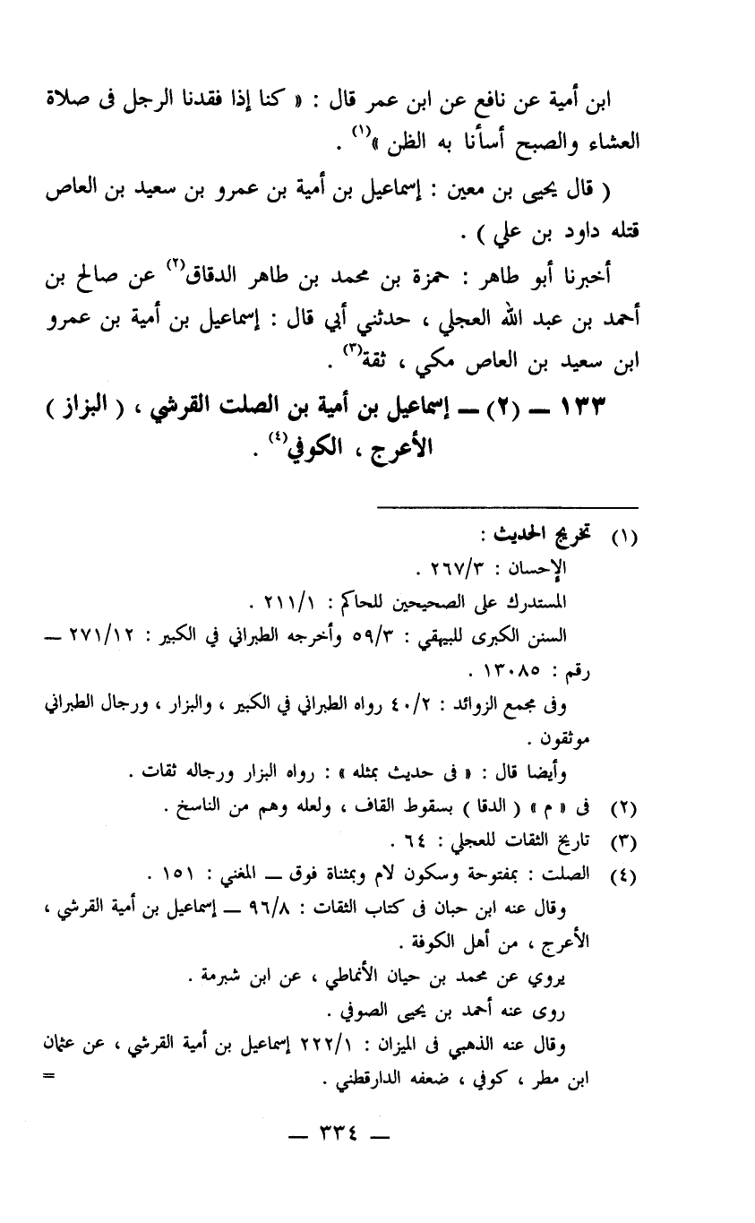 ابن أمية عن نافع عن ابن عمر قال كنا إذا فقدنا الرجل في صلاة العشاء والصبح أسأنا به الظن قال يحيى بن معين إسماعيل بن أمية بن عمرو بن سعيد بن العاص قتله داود بن علي أخبرنا أبو طاهر حمزة بن محمد بن طاهر الدقاق عن صالح بن أحمد بن عبد الله العجلي حدثني أبي قال إسماعيل بن أمية بن عمرو ابن سعيد بن العاص مكي ثقة.