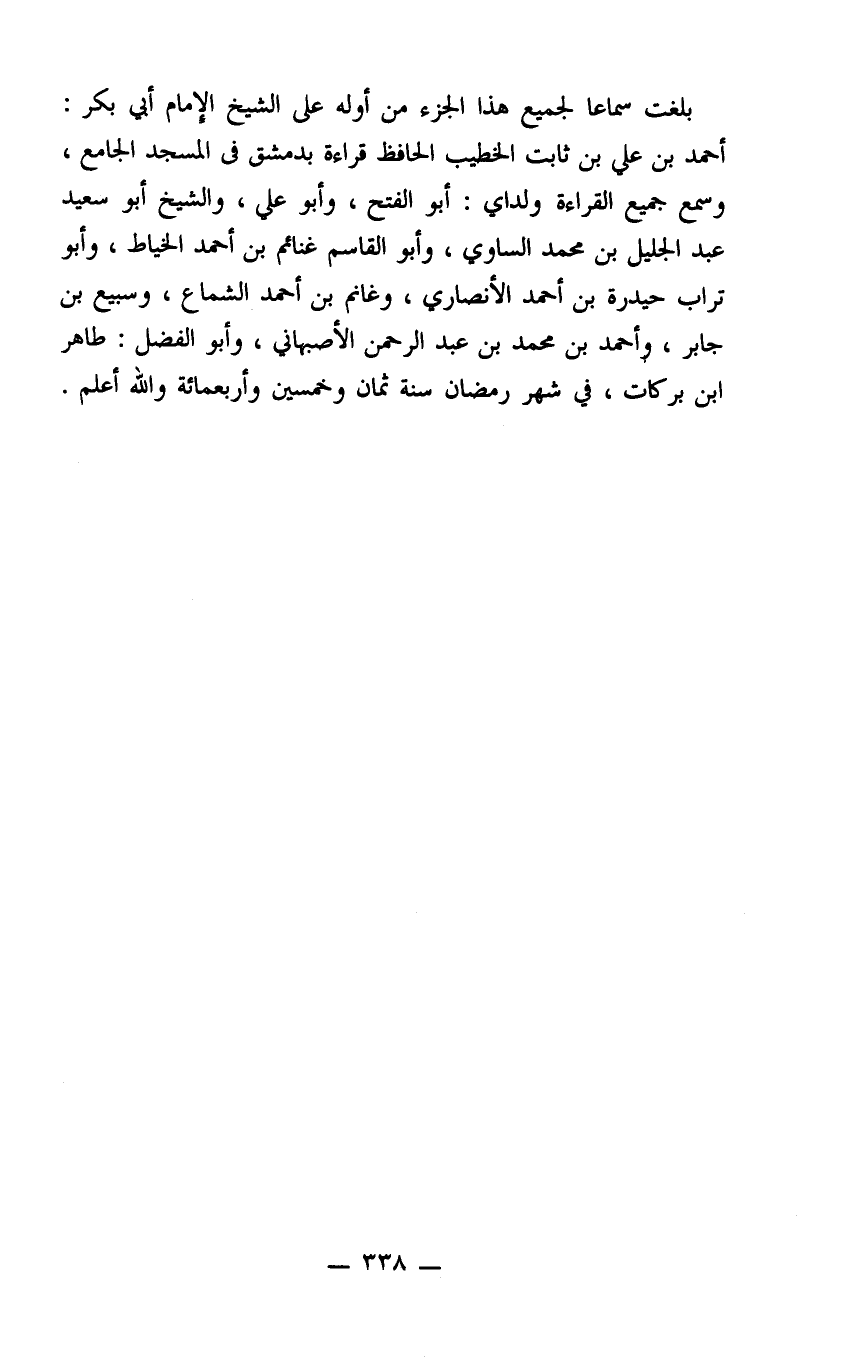 بلغت سماعا لجميع هذا الجزء من أول على الشيخ الإمام أبي بكر أحمد بن علي بن ثابت الخطيب الحافظ قراءة بدمشق في المسجد الجامع وسمع جميع القراءة والداي أبو الفتح وأبو علي والشيخ أبو سعيد عبد الجليل بن محمد الساوي وأبو القاسم غنائم بن أحمد الخياط وأبو تراب حيدرة بن أحمد الأنصاري وغانم بن أحمد الشماع وسبيع بن جابر وأحمد بن محمد بن عبد الرحمن الأصبهاني وأبو الفضل طاهر ابن بركات في شهر رمضان سنة ثمان وخمسين وأربعمائة والله أعلم.