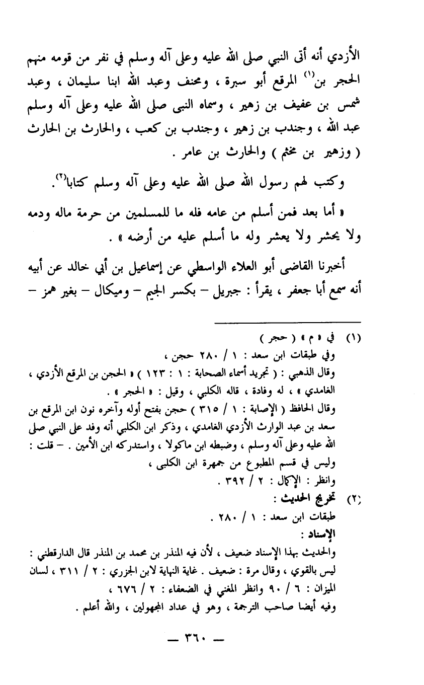 الأزدي أنه أتى النبي صلى الله عليه وعلى آله وسلم في نفر من قومه منهم الحجر بن المرقع أبو سبرة ومحنف وعبد الله ابنا سليمان وعبد شمس بن عفيف بن زهير وسماه النبي صلى الله عليه وعلى آله وسلم عبد الله وجندب بن زهير وجندب بن كعب والحارث بن الحارث وزهير بن مخثم والحارث بن عامر وكتب لهم رسول الله صلى الله عليه وعلى آله وسلم كتابا أما بعد فمن أسلم من عامه فله ما للمسلمين من حرمة ماله ودمه ولا يحشر ولا يعشر وله ما أسلم عليه من أرضه أخبرنا القاضي أبو العلاء الواسطي عن إسماعيل بن أبي خالد عن أبيه أنه سمع أبا جعفر يقرأ جبريل بكسر الجيم وميكال بغير همز.