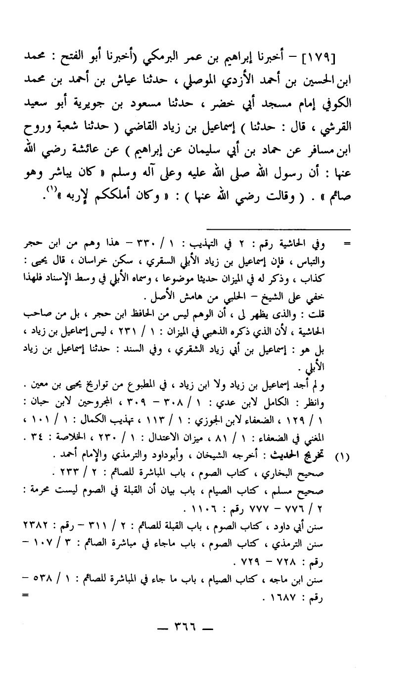 (179) أخبرنا إبراهيم بن عمر البرمكي أخبرنا أبو الفتح محمد بن الحسين بن أحمد الأزدي الموصلي حدثنا عياش بن أحمد بن محمد الكوفي إمام مسجد أبي خضر حدثنا مسعود بن جويرية أبو سعيد القرشي قال حدثنا إسماعيل بن زياد القاضي حدثنا شعبة وروح بن مسافر عن حماد بن أبي سليمان عن إبراهيم عن عائشة رضي الله عنها أن رسول الله صلى الله عليه وعلى آله وسلم كان يباشر وهو صائم وقالت رضي الله عنها وكان أملككم لإربه.