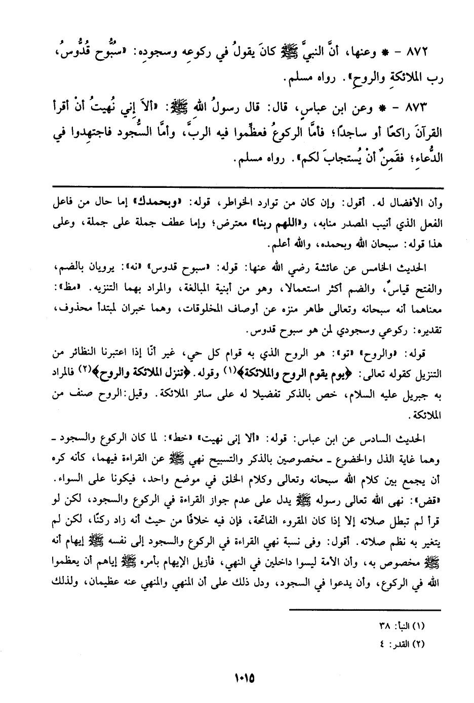 873 - وعن ابن عباس، قال: قال رسول الله صلى الله عليه وسلم: ألا إني نهيت أن أقرأ القرآن راكعاً أو ساجداً؛ فأما الركوع فعظموا فيه الرب، وأما السجود فاجتهدوا في الدعاء؛ فقمن أن يستجاب لكم)). رواه مسلم.