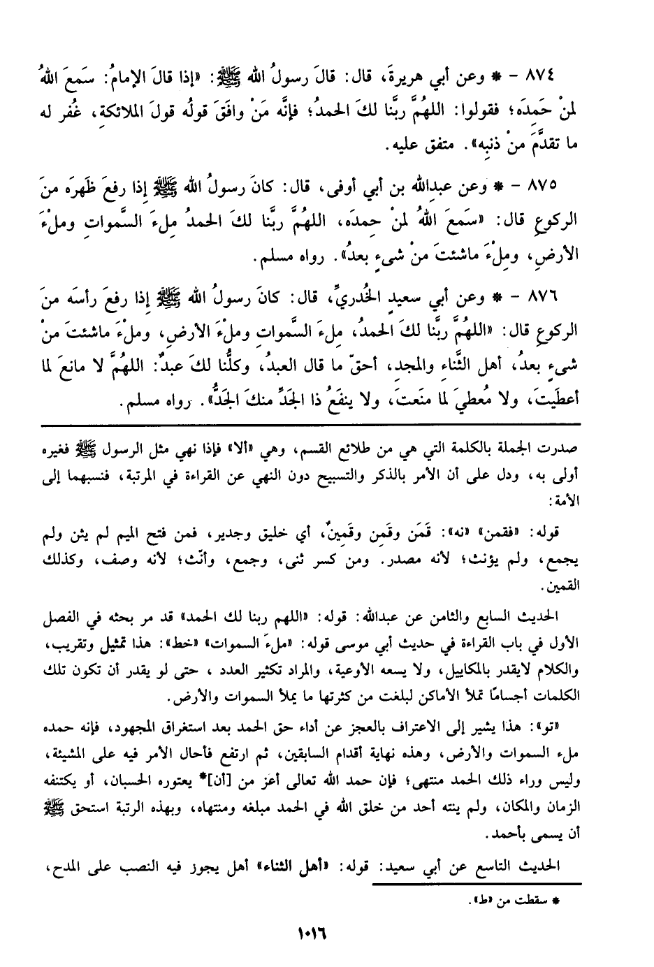 875 - وعن عبد الله بن أبي أوفي، قال: كان رسول الله صلى الله عليه وسلم إذا رفع ظهره من الركوع قال: ((سمع الله لمن حمده، اللهم ربنا لك الحمد ملء السموات وملء الأرض، وملء ما شئت من شيء بعد)). رواه مسلم.