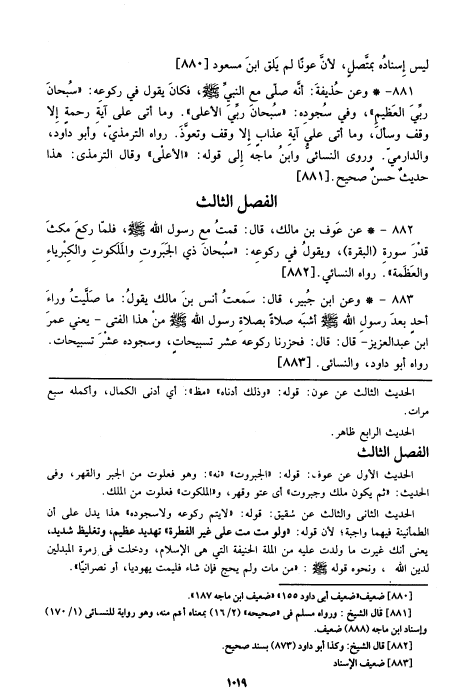 881 - وعن حذيفة: أنه صلي مع النبي صلى الله عليه وسلم، فكان يقول في ركوعه: ((سبحان ربي العظيم))، وفي سجوده: ((سبحان ربي الأعلي)). وما أتى علي آية رحمة إلا وقف وسأل، وما أتى علي آية عذاب إلا وقف وتعوذ. رواه الترمذي، وأبو داود، والدارمي. وروى النسائي وابن ماجه إلي قوله: ((الأعلي)) وقال الترمذي: هذا حديث حسن صحيح. [881]