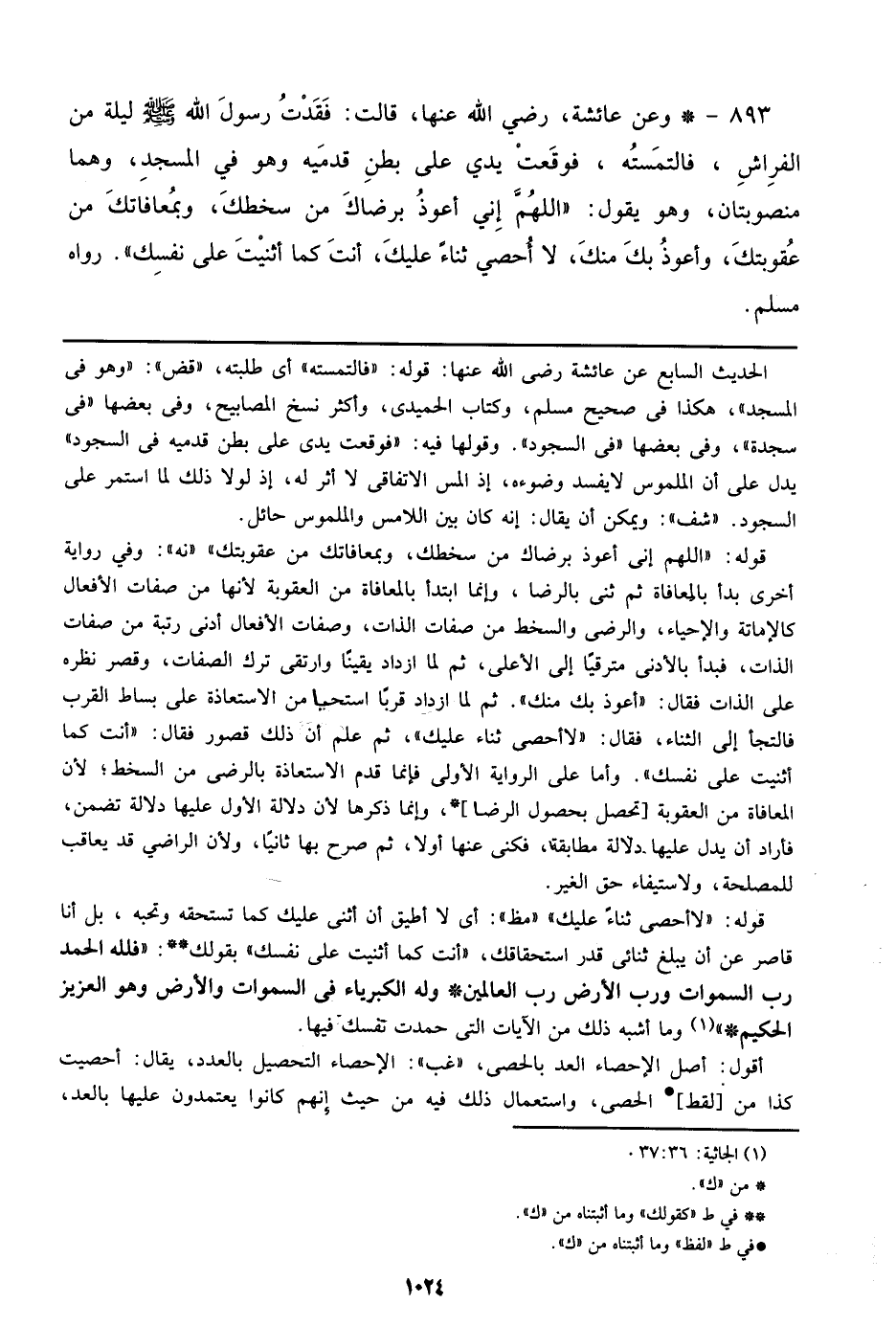 893 - وعن عائشة، رضي الله عنها، قالت: فقدت رسول الله صلى الله عليه وسلم ليلة من الفراش، فالتمسته، فوقعت يدي علي بطن قدميه وهو في المسجد، وهما منصوبتان، وهو يقول: ((اللهم إني أعوذ برضاك من سخطك، وبمعافاتك من عقوبتك، وأعوذ بك منك، لا أحصي ثناء عليك، أنت كما أثنيت علي نفسك)). رواه مسلم.