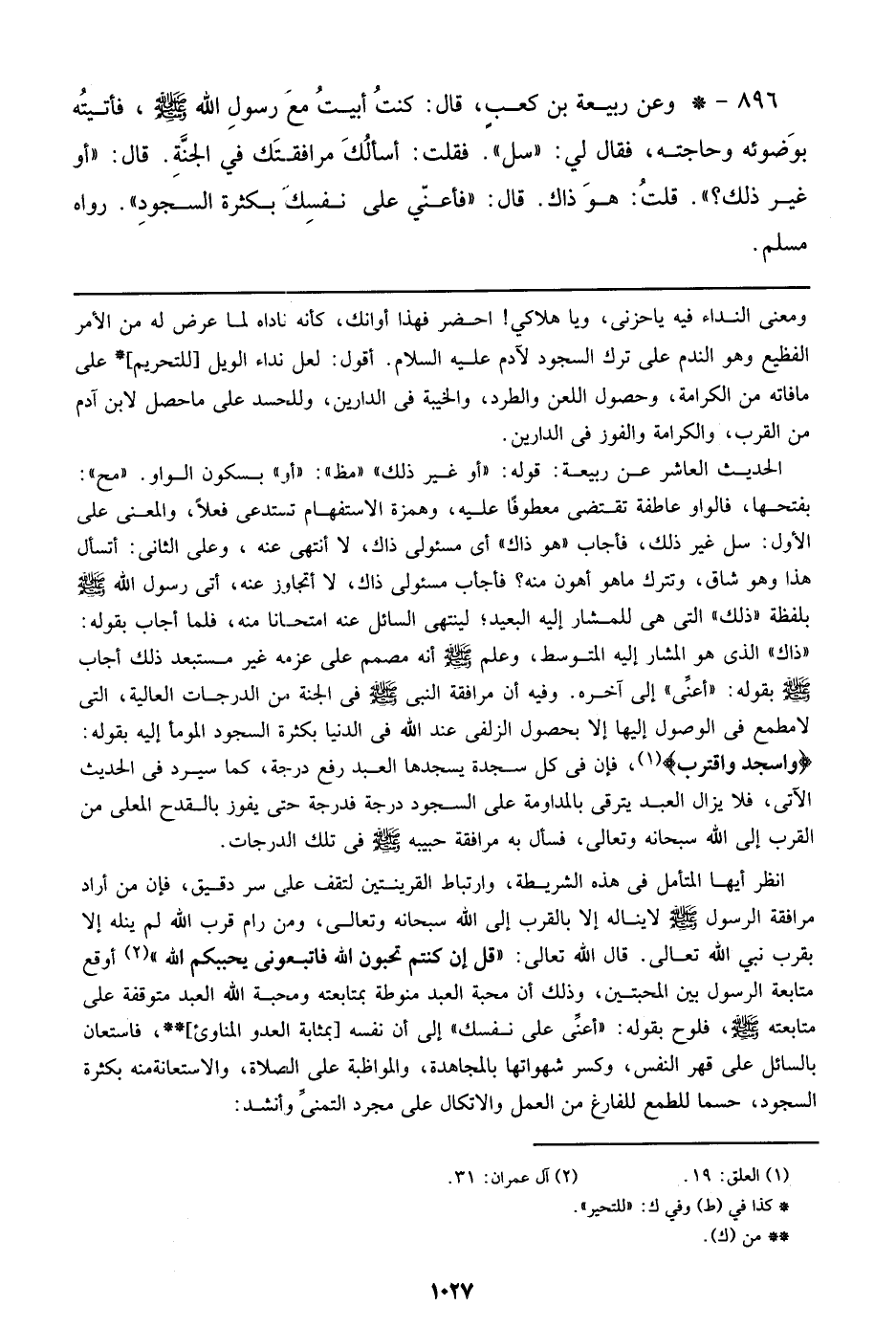 انظر أيها المتأمل في هذه الشريطة، وارتباط القرينتين لتقف علي سر دقيق، فإن من أراد مرافقة الرسول صلى الله عليه وسلم لا يناله إلا بالقرب إلي الله سبحانه وتعالي، ومن رام قرب الله لم ينله إلا بقرب نبي الله تعالي. قال الله تعالي: {قل إن كنتم تحبون الله فاتبعوني يحببكم الله} أوقع متابعة الرسول بين المحبتين، وذلك أن محبة العبد منوطة بمتابعته ومحبة الله العبد متوقفة علي متابعته صلى الله عليه وسلم، فلوح بقوله: ((أعني علي نفسك)) إلي أن نفسه [بمثابة العدو المناوئ]، فاستعان بالسائل علي قهو النفس، وكسر شهواتها بالمجاهدة، والمواظبة علي الصلاة، والاستعانة بكثرة السجود، حسما للطمع الفارغ من العمل والاتكال علي مجرد التمني وأنشد: