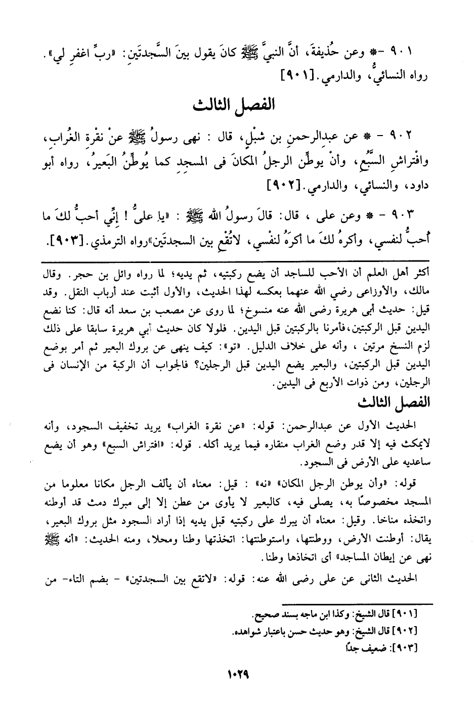 902 - عن عبد الرحمن بن شبل، قال: نهي رسول الله صلى الله عليه وسلم عن نقرة الغراب، وافتراش السبع، وأن يوطن الرجل المكان في المسجد كما يوطن البعير، رواه أبو داود، والنسائي، والدارمي. [902]