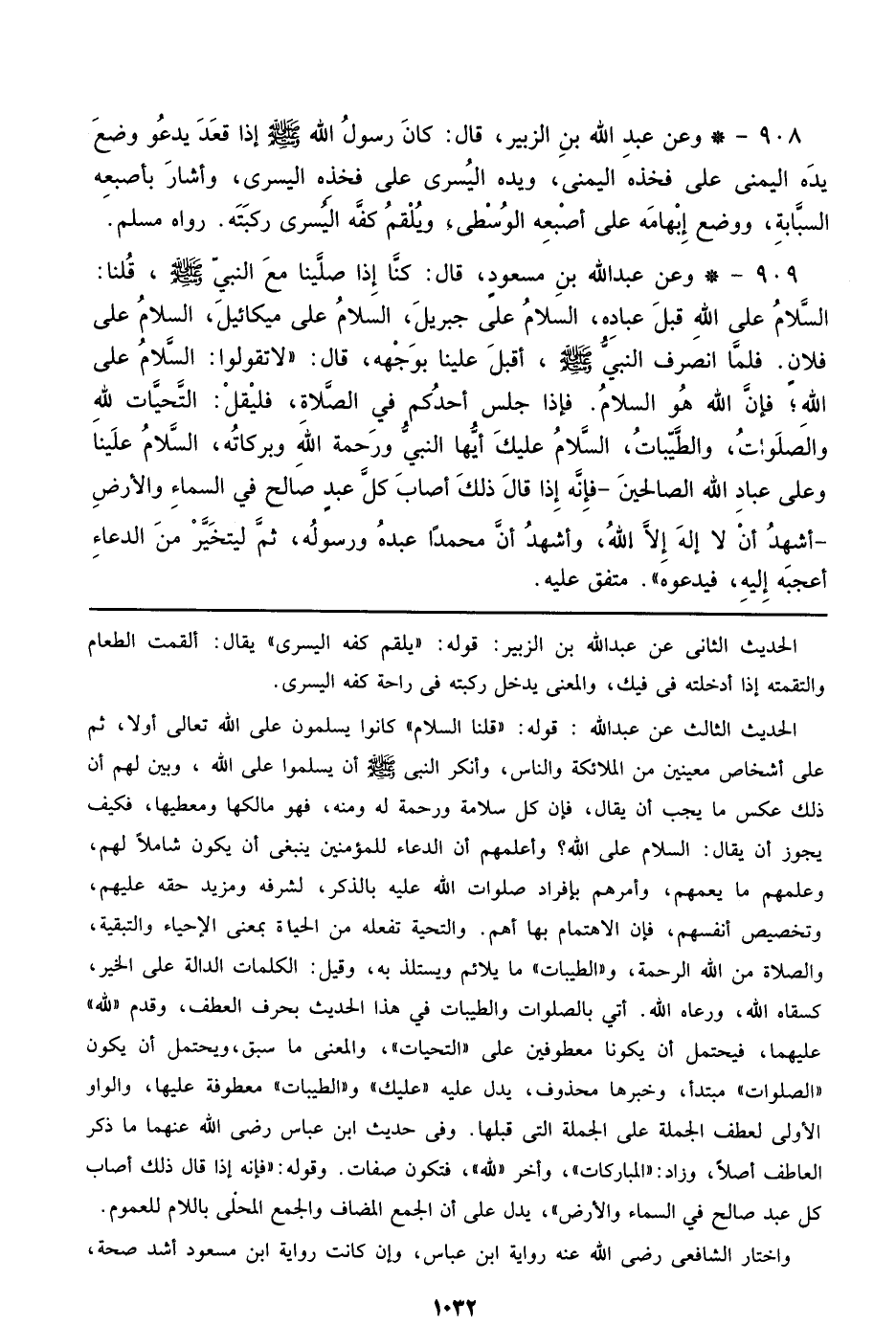 909 - وعن عبد الله بن مسعود، قال: كنا إذا صلينا مع النبي صلى الله عليه وسلم، قلنا: السلام علي الله قبل عباده، السلام علي جبريل، السلام علي ميكائيل، السلام علي فلان. فلما انصرف النبي صلى الله عليه وسلم، أقبل علينا بوجهه، قال: ((لا تقولوا: السلام علي الله؛ فإن الله هو السلام. فإذا جلس أحدكم في الصلاة، فليقل التحيات لله والصلوات، والطيبات، السلام عليك أيها النبي ورحمة الله وبركاته، السلام علينا وعلي عباد الله الصالحين- فإنه إذا قال ذلك أصاب كل عبد صالح في السماء والأرض- أشهد أن لا إله إلا الله، وأشهد أن محمداً عبده ورسوله، ثم ليتخير من الدعاء أعجبه إليه، فيدعوه)). متفق عليه.
