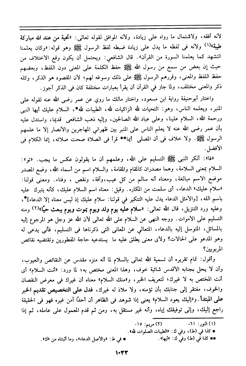وأقول: تمام تقريره أن تسمية الله تعالي بالسلام لما أنه منزه مقدس عن النقائض والعيوب، وأن لا يحل بجانبه الأقداس شائبة خوف، وهذا المعنى مختص به؛ لما ورد: ((أنت السلام)) أي أنت المختص به لا غيرك؛ لتعريف الخبر، و ((منك السلام)) معناه أن غيرك في معرض النقصان والخوف، مفتقر إلي جانبك بأن تؤمنه، ولا ملاذ له غيرك، فدل علي التخصيص تقدير الخبر علي المبتدأ. و ((إليك يعود السلام)) يعني إذا شوهد في الظاهر أن أحداً آمن غيره فهو في الحقيقة راجع إليك، وإلي توفيقك إياه، وأنك غير مستقل به، ومن ثم قدم المعمول علي عامله، ثم إذا