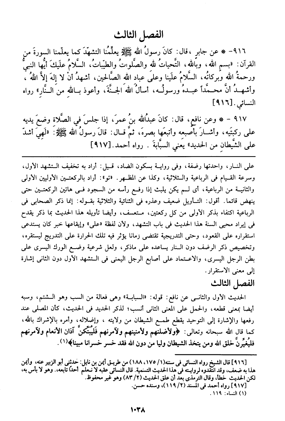 الحديث الأول والثاني عن نافع: قوله: ((السبابة)) وهي فعالة من السب وهو الشتم، وسبه أيضاً بمعنى قطعة، والحمل علي المعنى الثاني أنسب؛ لذكر الحديد في الحديث، كأن المصلي عند رفعها والإشارة إلي التوحيد يقطع طمع الشيطان من ولايته، وإضلاله، وأمره بالإشراك بالله، كما قال الله سبحانه وتعالي: {ولأضلنهم ولأمنينهم ولآمرنهم فليبتكن آذان الأنعام ولآمرنهم فليغيرن خلق الله ومن يتخذ الشيطان ولياً من دون الله فقد خسر خسراناً مبينا}.