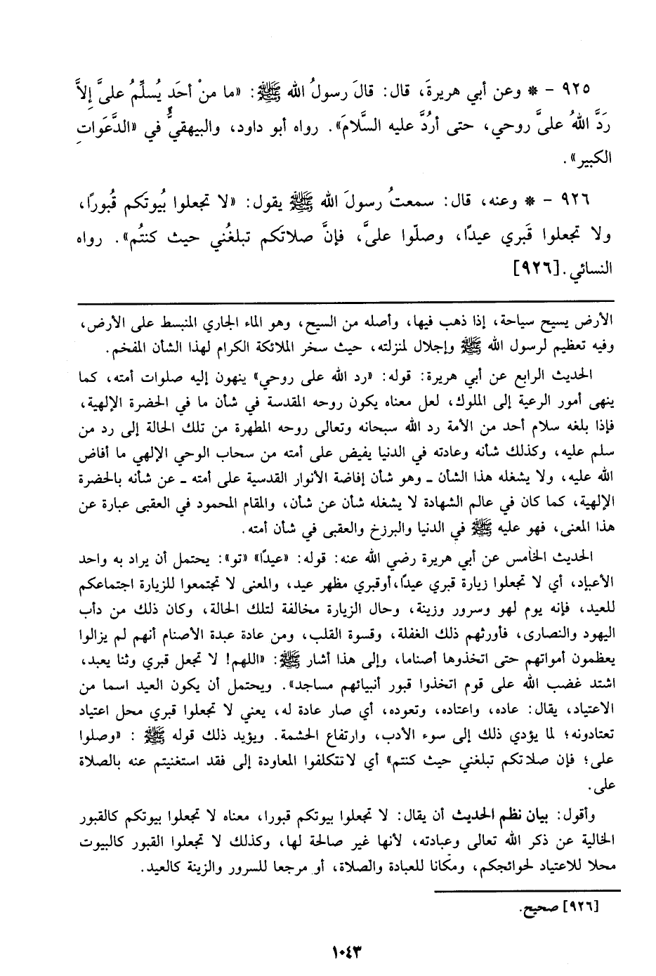 926 - وعنه، قال: سمعت رسول الله صلى الله عليه وسلم يقول: ((لا تجعلوا بيوتكم قبوراً، ولا تجعلوا قبري عيداً، وصلوا علي، فإن صلاتكم تبلغني حيث كنتم)). رواه النسائي. [926]