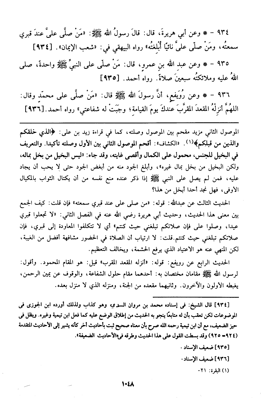 936 - وعن رويفع، أن رسول الله صلى الله عليه وسلم قال: ((من صلي علي محمد وقال: اللهم أنزله المقعد المقرب عندك يوم القيامة؛ وجبت له شفاعيت)) رواه أحمد. [936]