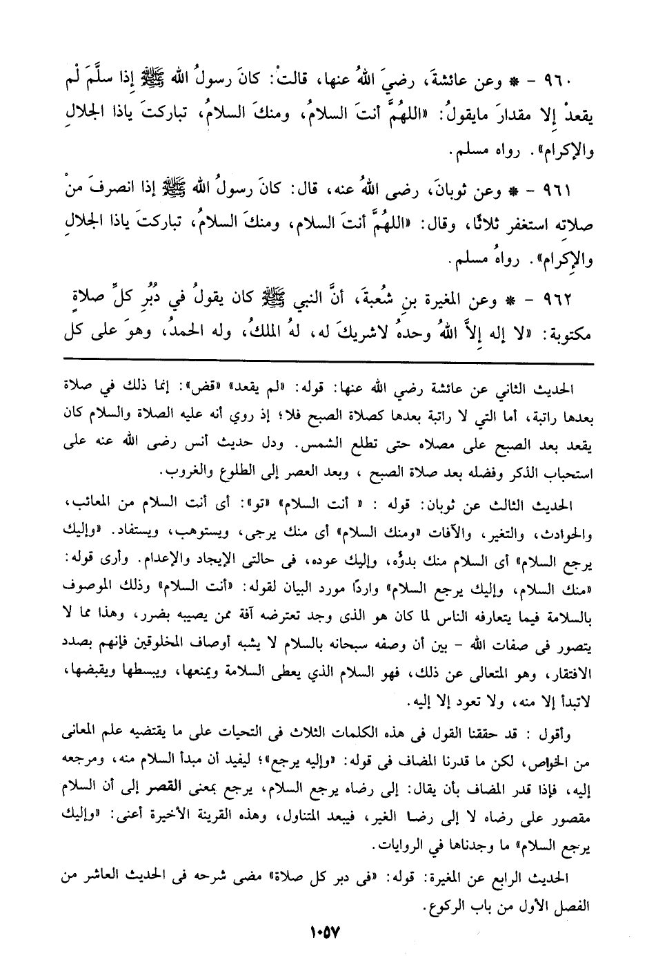 961 - وعن ثوبان، رضي الله عنه، قال: كان رسول الله إذا انصرف من صلاته استغفر ثلاثاً، وقال: ((اللهم أنت السلام، ومنك السلام، تباركت ياذا الجلال والإكرام)). رواه مسلم.
