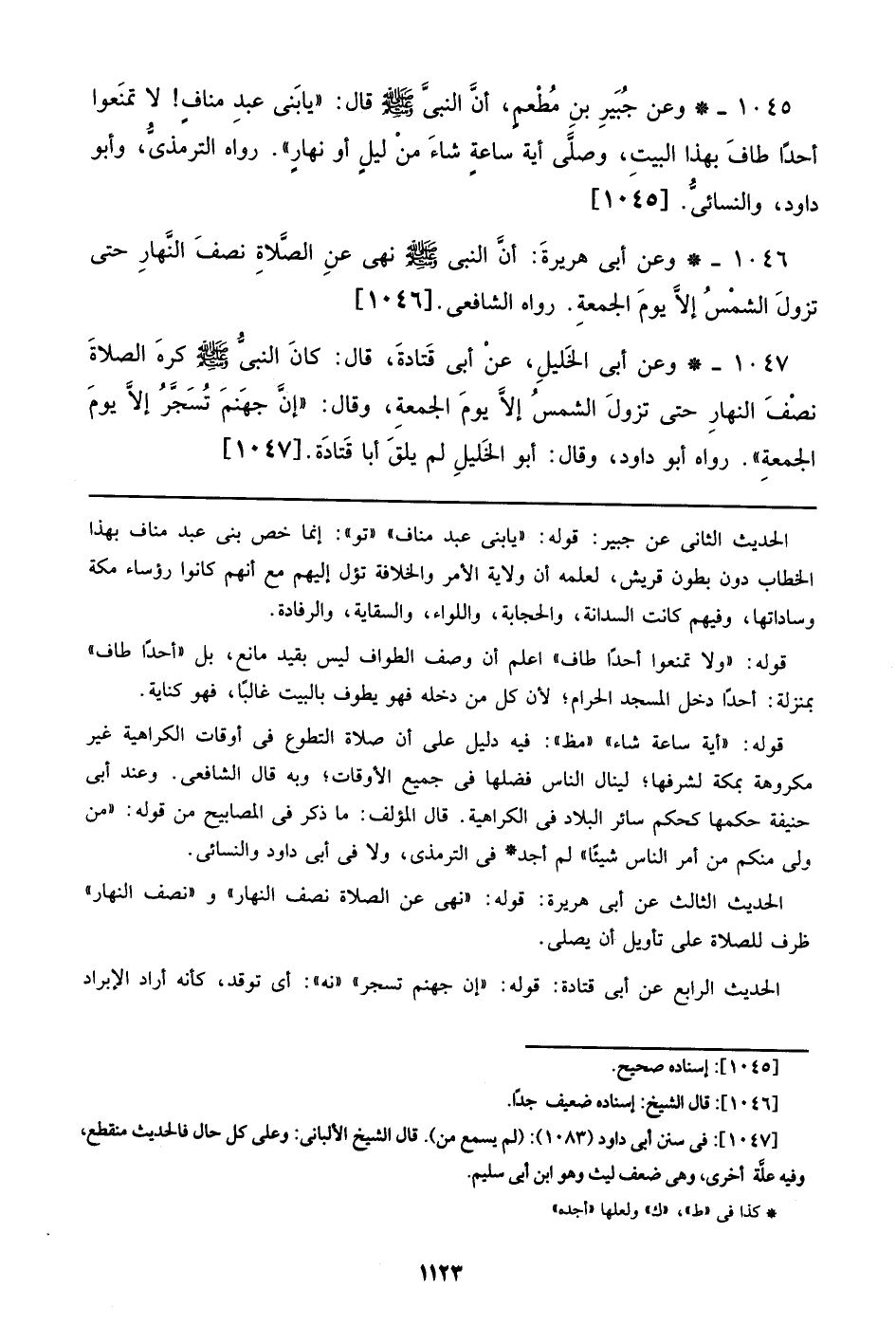 1045 - وعن جبير بن مطعم، أن النبي صلى الله عليه وسلم قال: ((يا بني عبد مناف! لا تمنعوا أحداً طاف بهذا البيت، وصلي أية ساعة شاء من الليل أو نهار)). رواه الترمذي، وأبو داود، والنسائي. [1045]