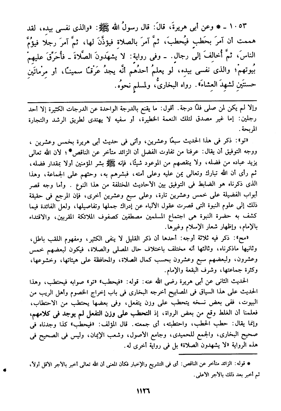 1053 - وعن أبي هريرة، قال: قال رسول الله صلى الله عليه وسلم: ((والذي نفسي بيده، لقد هممت أن آمر بحطب فيحطب، ثم آمر بالصلاة فيؤذن لها، ثم آمر رجلاً فيؤم الناس، ثم أخالف إلي رجال- وفي رواية: لا يشهدون الصلاة- فأحرق عليهم بيوتهم؛ والذي نفسي بيده، لو يعلم أحدهم أنه يجد عرقا سميناً، أو مرماتين حسنتين لشهد العشاء)). رواه البخاري، ولمسلم نحوه.