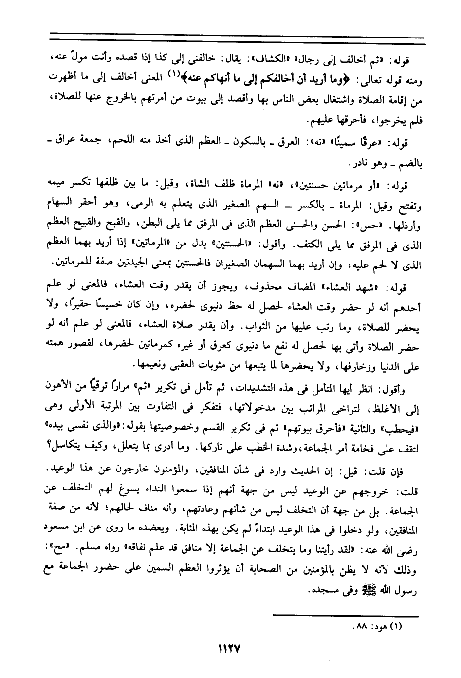 وأقول: انظر أيها المتأمل في هذه التشديدات، ثم تأمل في تكرير ((ثم)) مراراً ترقياً من الأهون إلي الأغلظ، لتراخي المراتب بين مدخولاتها، فتفكر في التفاوت بين المرتبة الأولي هي ((فيحطب)) والثانية ((فأحرق بيوتهم)) ثم في تكرير القسم وخصوصيتها بقوله: ((والذي نفسي بيده)) لتقف علي فخامة أمر الجماعة، وشدة الخطب علي تاركها. وما أدى بما يتعلل، وكيف يتكاسل؟
