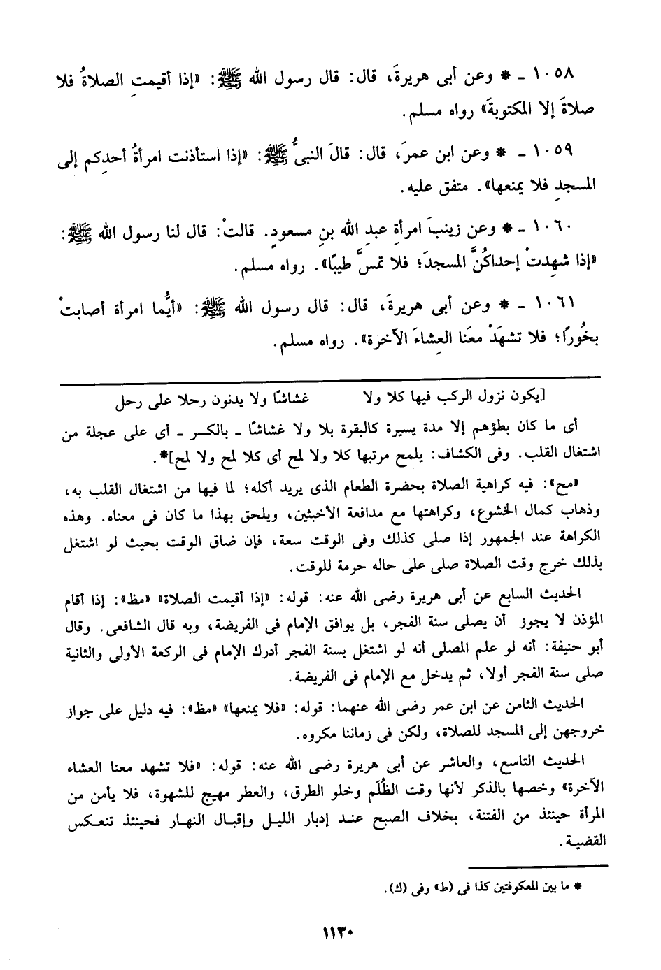 1059 - وعن ابن عمر، قال: قال النبي صلى الله عليه وسلم: ((إذا استأذنت امرأ أحدكم إلي المسجد فلا يمنعها)). متفق عليه.