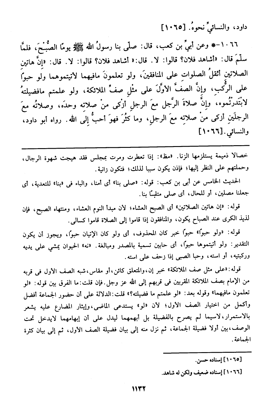 1066 - وعن أبي بن كعب، قال: صلي بنا رسول الله صلى الله عليه وسلم يوماً الصبح، فلما سلم قال: ((أشاهد فلان. قالوا: لا. قال: ((أشاهد فلان؟ قالوا: لا. قال: ((إن هاتين الصلاتين أثقل الصلوات علي المنافقين، ولو تعلمون ما فيهما لأتيتموهما ولو حبوا علي الركب، وإن الصف الأول علي مثل صف الملائكة، ولو علمتم ما فضيلته لابتدرتموه، وإن صلاة الرجل مع الرجل أزكى من صلاته وحده، وصلاته مع الرجلين أزكى من صلاته مع الرجل، وما كثر فهو أحب إلي الله. رواه أبو داود، والنسائي. [1066]