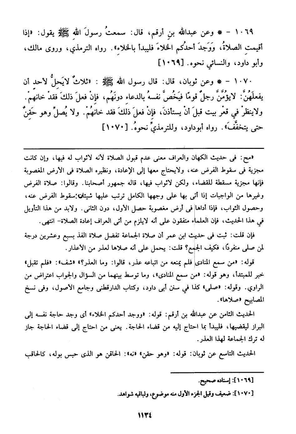 1069 - وعن عبد الله بن أرقم، قال: سمعت رسول الله صلى الله عليه وسلم يقول: ((إذا أقيمت الصلاة، ووجد أحدكم الخلاء فليبدأ بالخلاء)). رواه الترمذي، وروى مالك، وأبو داود، والنسائي نحوه. [1069]