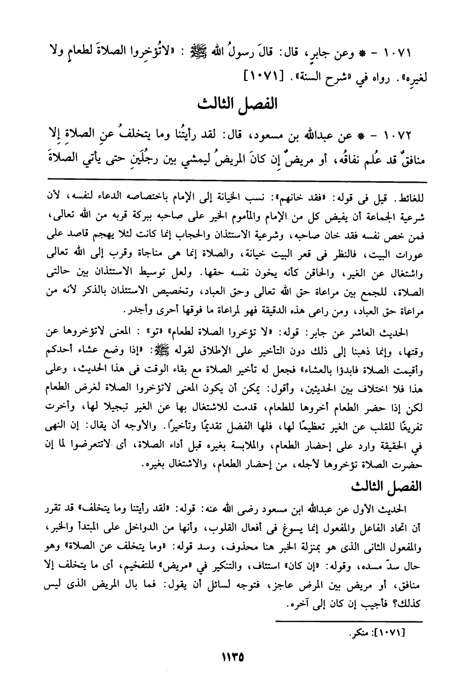 1071 - وعن جابر، قال: قال رسول الله صلى الله عليه وسلم: ((لا تؤخروا الصلاة لطعام ولا لغيره)). رواه في ((شرح السنة)). [1071]