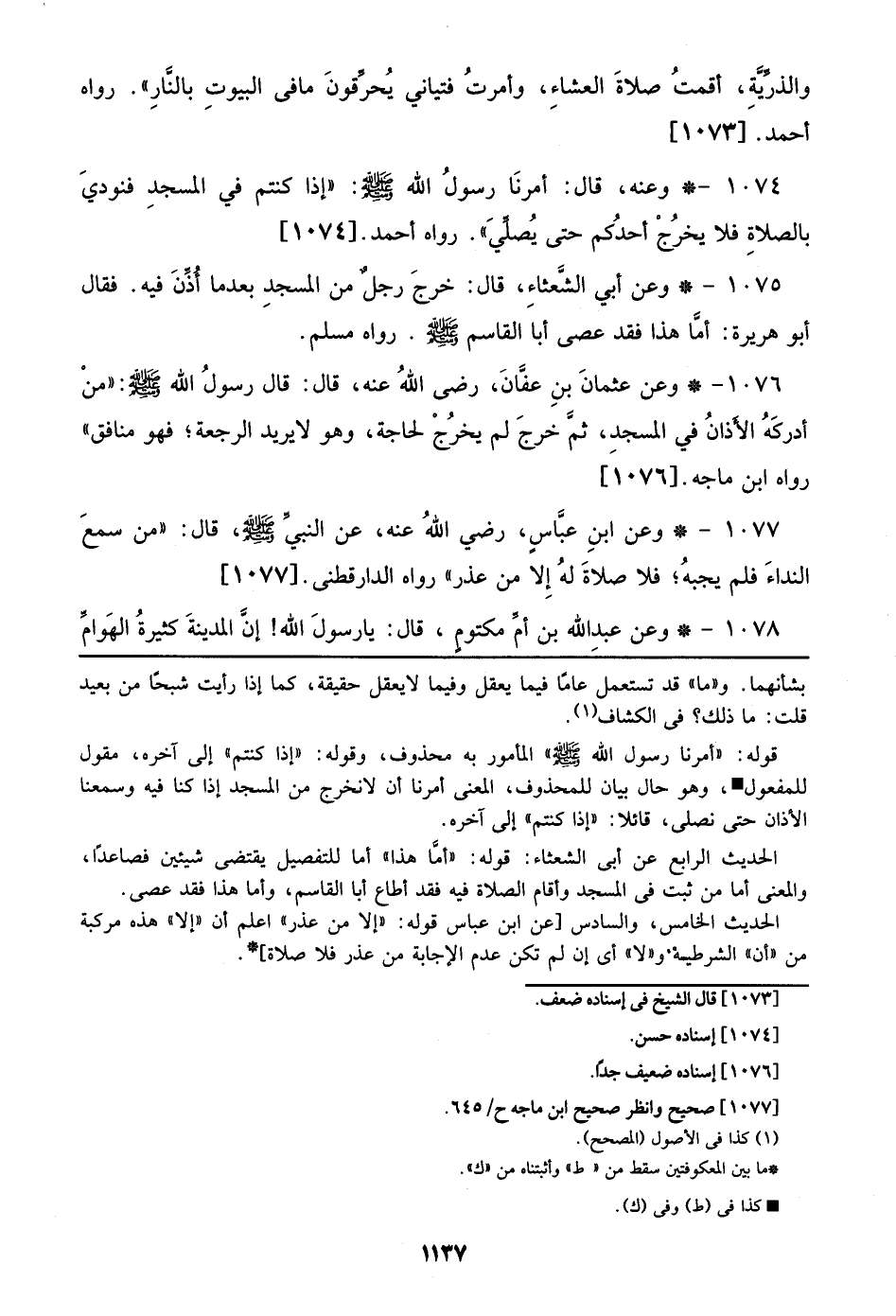 1077 - وعن ابن عباس، رضي الله عنه، عن النبي صلى الله عليه وسلم، قال: ((من سمع النداء فلم يجبه؛ فلا صلاة له إلا من عذر)) رواه الدارقطني. [1077]
