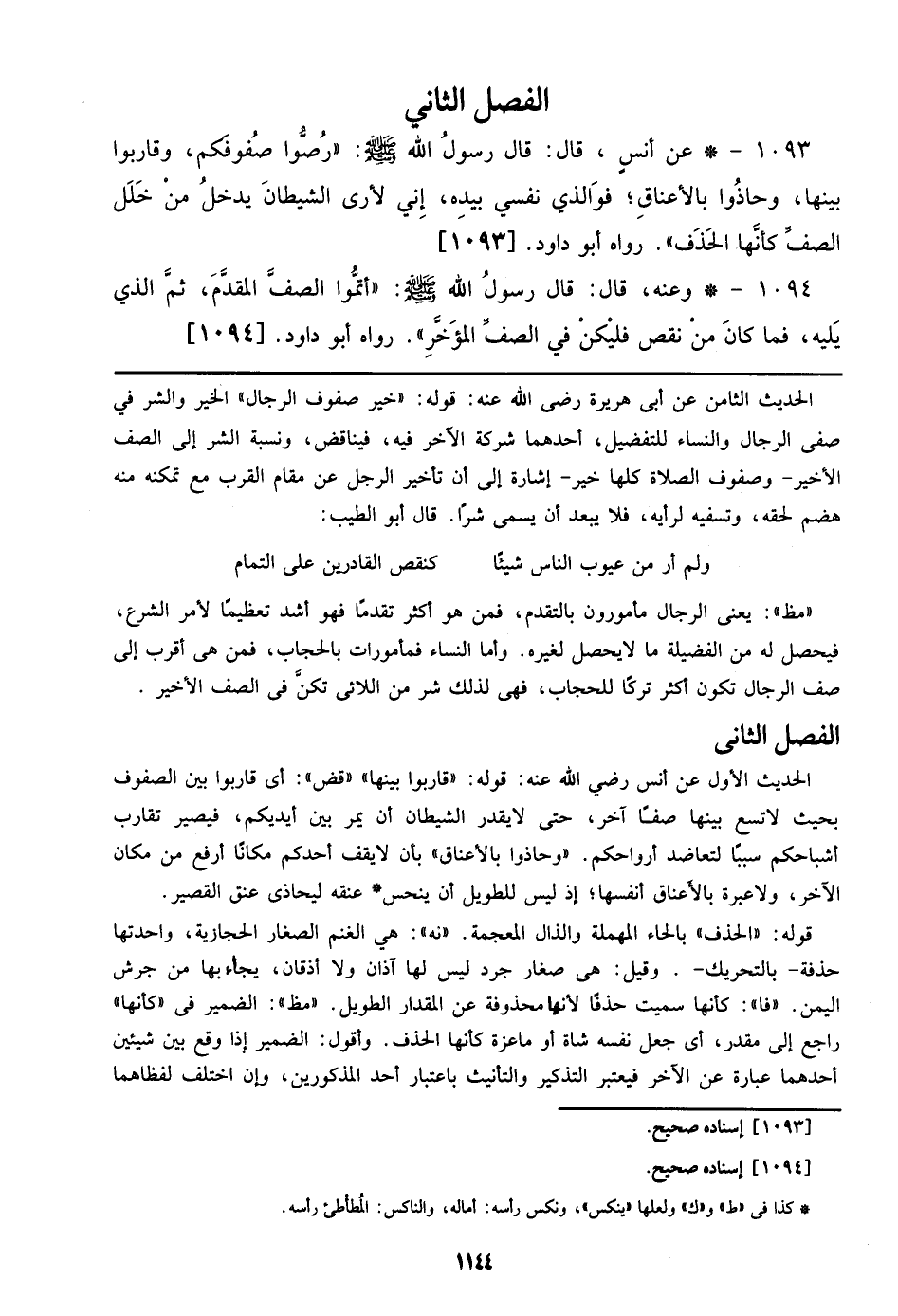 1094 - وعنه، قال: قال رسول الله صلى الله عليه وسلم: ((أتموا الصف المقدم، ثم الذي يليه، فما كان من نقص فليكن في الصف المؤخر)). رواه أبو داود. [1094]